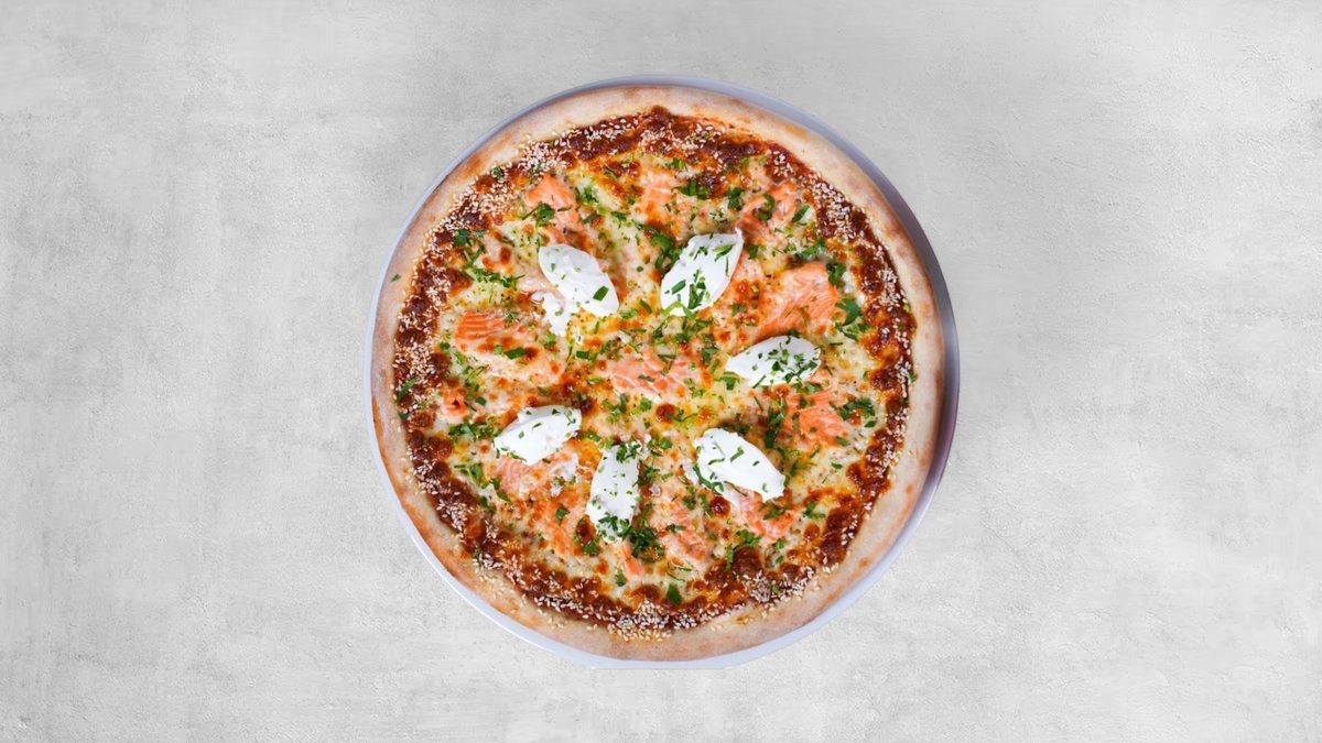 Tomātu mērce, mocarella siers, lasis, kremsiers, pētersiļi, sezama seklas.