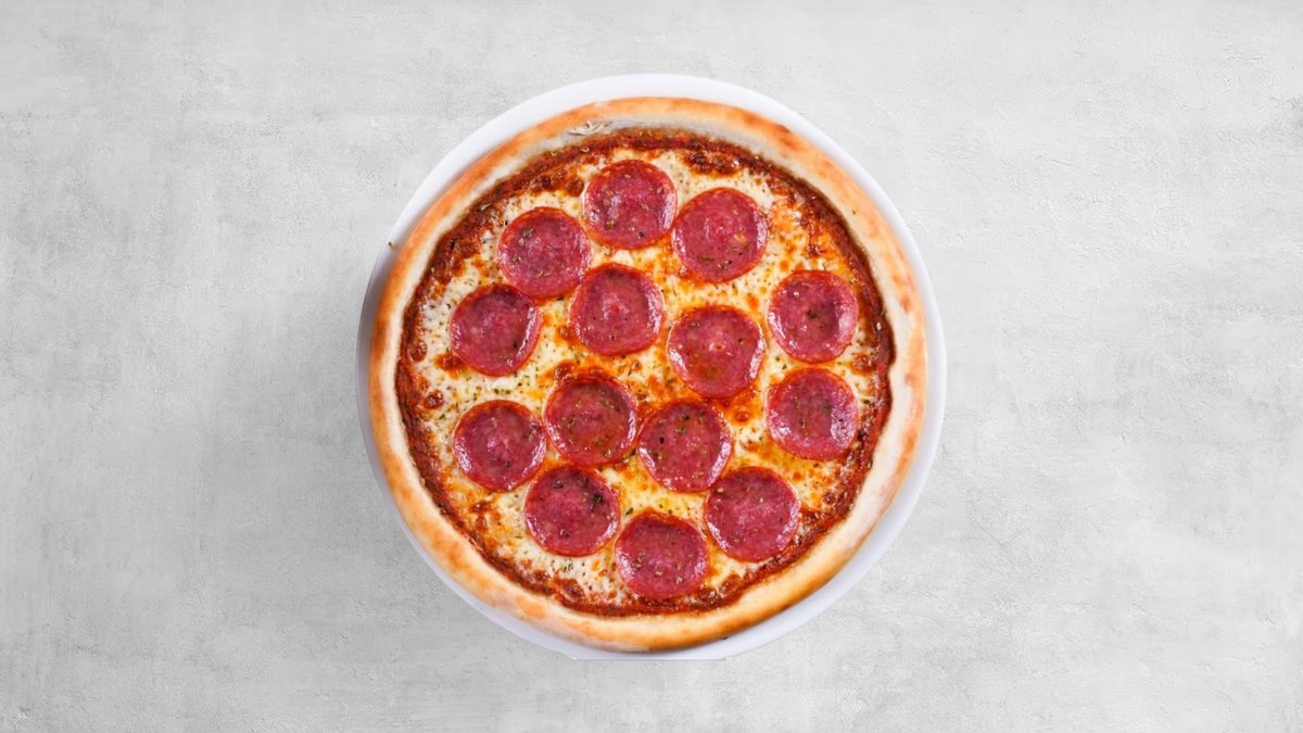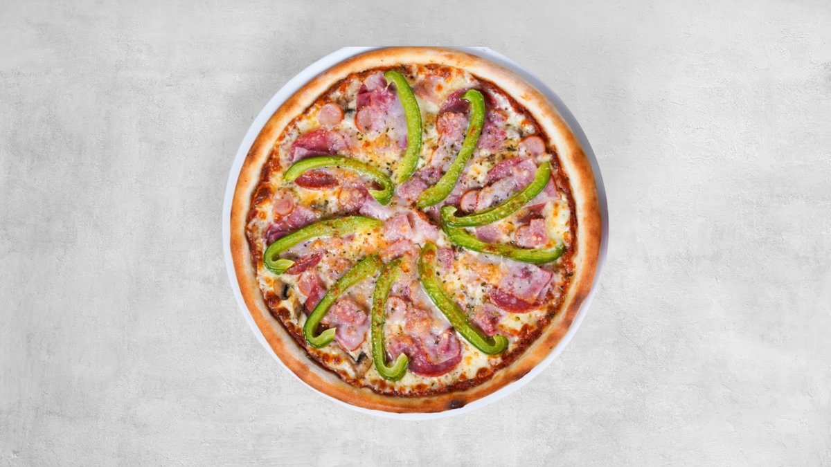 Tomātu mērce, mocarella siers, cietais siers, bekons, saļami, cīsiņi, šķiņķis, sēnes, pepperoni desa 🔥, zaļā paprika.