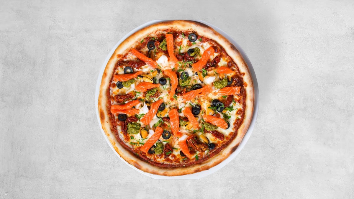 Tomātu mērce, mocarella siers, kūpināts lasis, garneles, mīdijas, kalmāri, kaltēti tomāti, olives, pesto mērce.