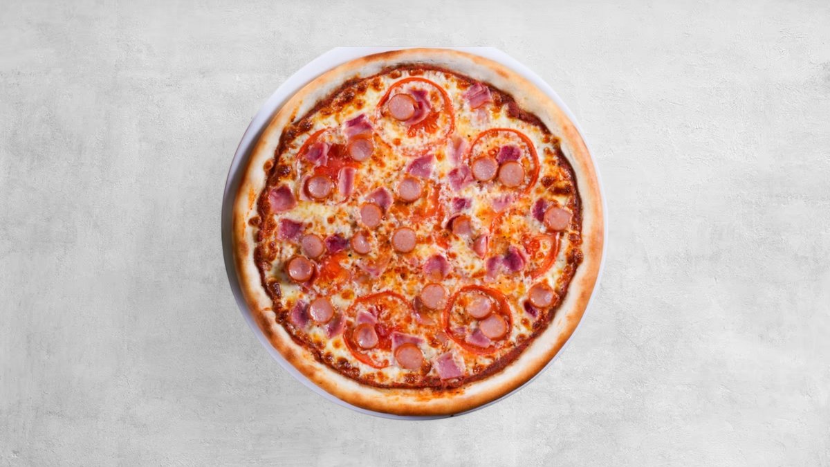 Tomātu mērce, mocarella siers, cīsiņi, šķiņķis, tomāti.