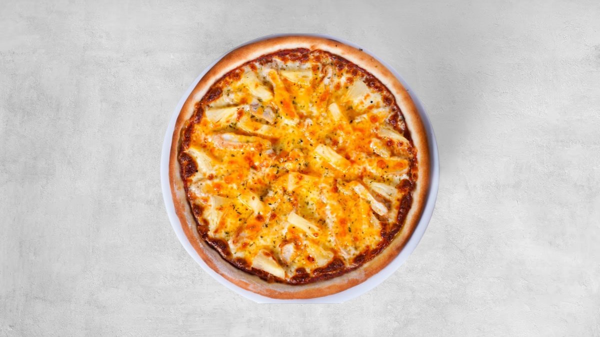 Tomātu mērce, mocarella siers, čederas siers, bbq vista, konservēti ananasi.