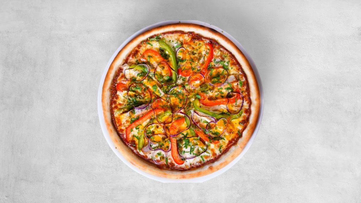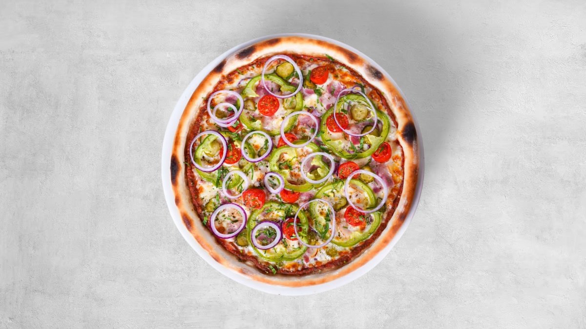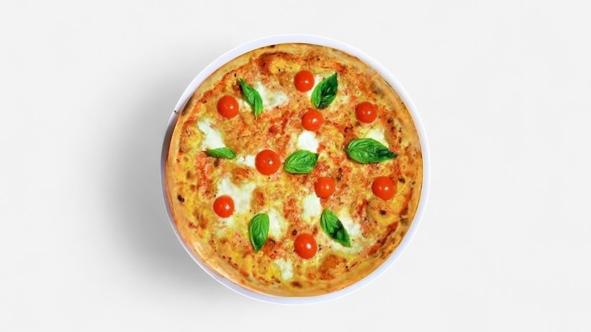 Tomātu mērce, mocarella siers, bekons, marinēti gurķi, sarkanie sīpoli, cherry tomāti, zaļā paprika pētersīļi, oregano.