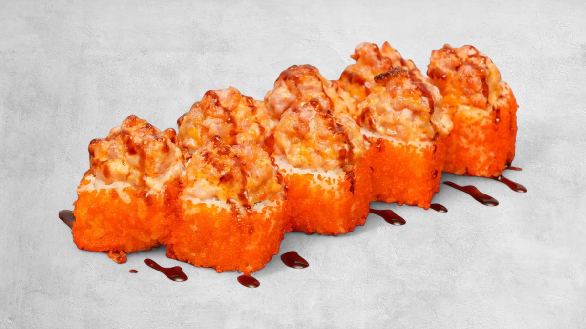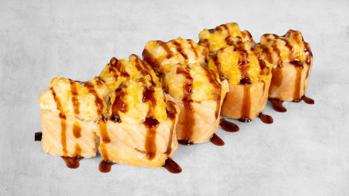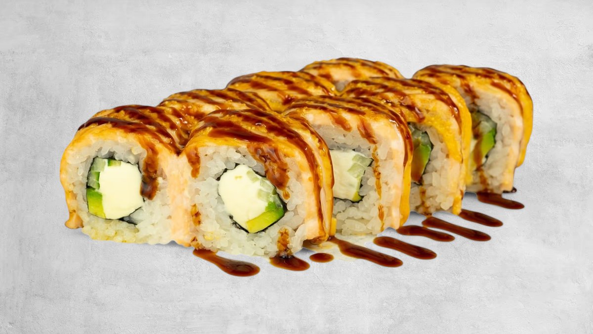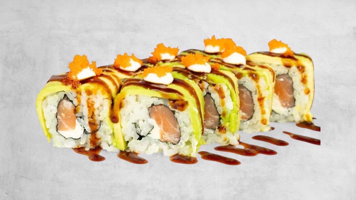 Teriyaki lasis, avokado, masago ikri, krēmsiers, unagi mērce