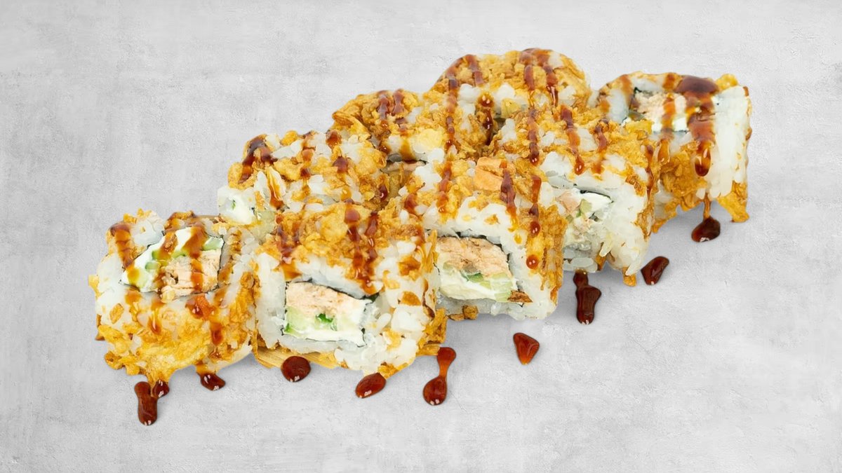 Teriyaki lasis, krēmsiers, gurķis, kaltētas tunča pārslas, unagi mērce. Alergēni - 1,2,4,7,10,12