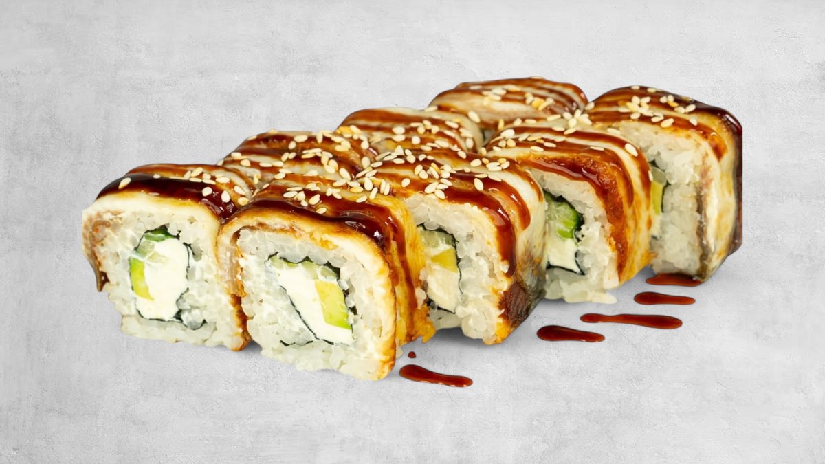 Kūpināts zutis, krēmsiers, avokado, tamagojaki, unagi un speciālā mērce