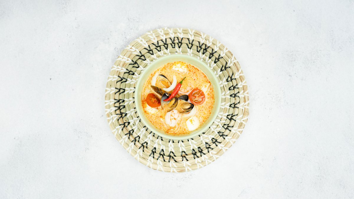 Asā Tom Yum zupa ar jūras produktiem garnelēm, midijām, kalmāra gredzeniem.