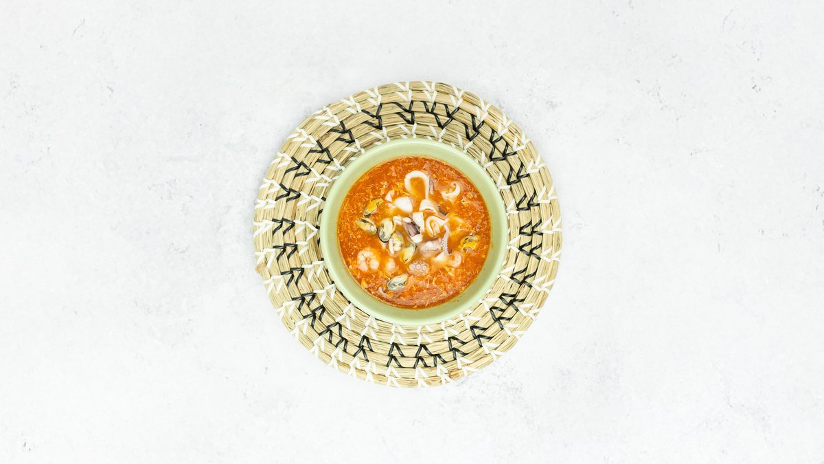 Asā tomātu krēmzupa ar jūras veltēm: garnelēm, mīdijām un astoņkājiem.