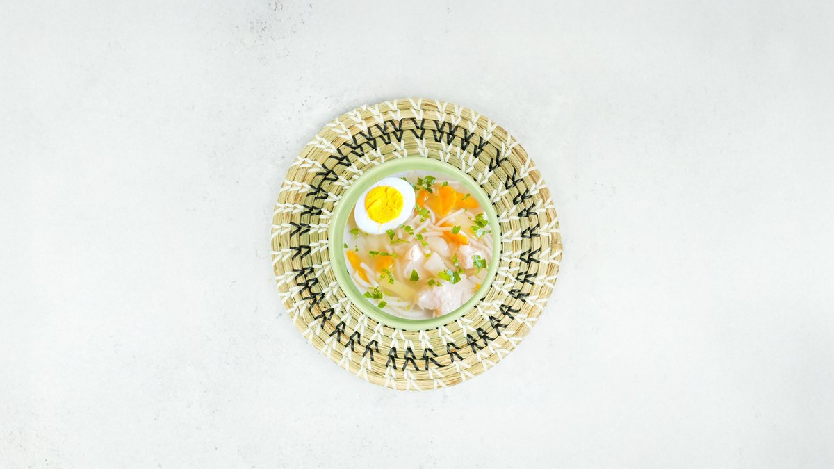 Kartupeļi, burkāni, sīpoli, vista, makaroni, zaļumi, ola.