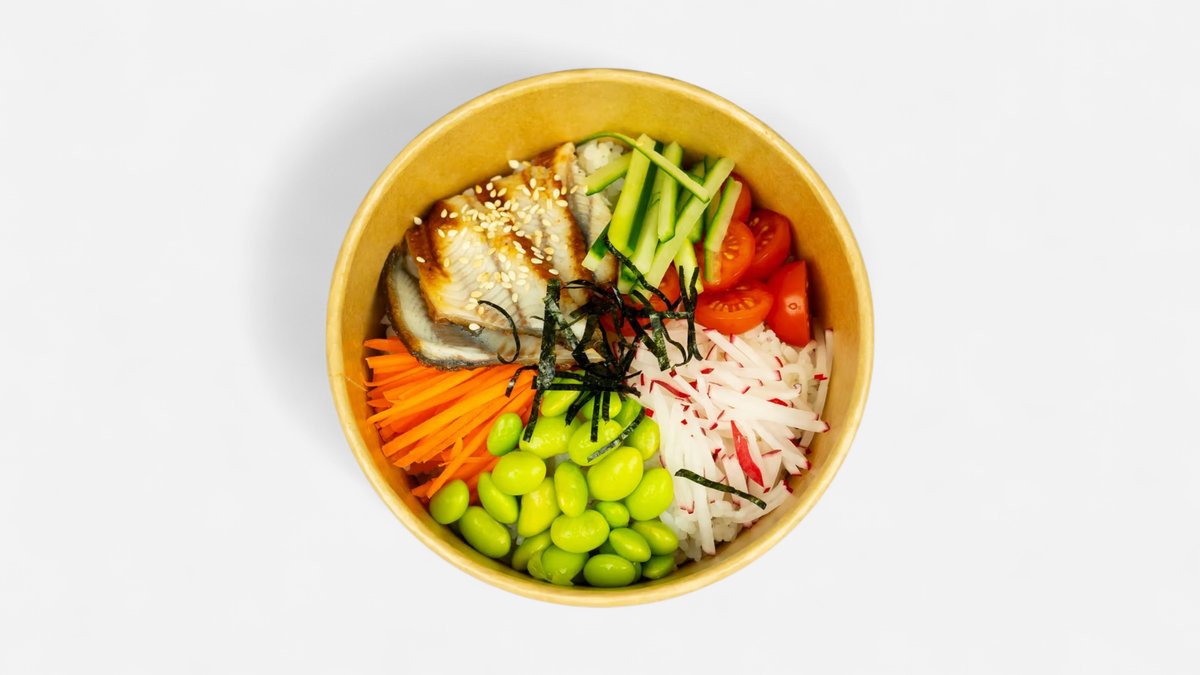 Burkāns, redīsi, gurķis, avokado, ķiršu tomāti, vārītas pupiņas, nori, sezama sēklas, poke un teriyaki mērce.