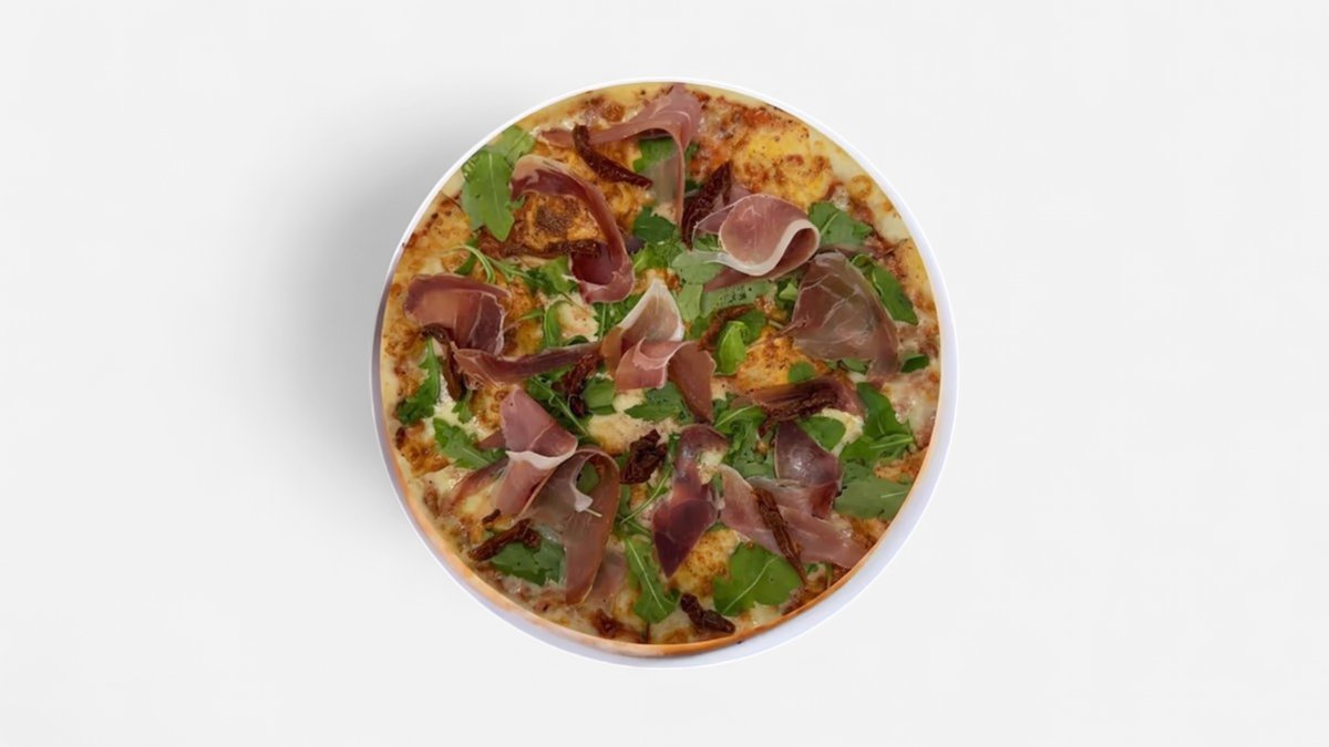Tomātu mērce, mocarellas siers, parmas šķinķis, rukola, saulē kaltēti tomāti.