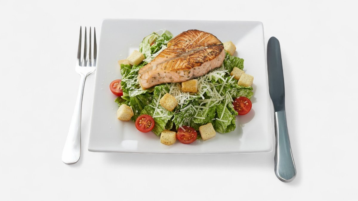 Romain, Caesar mērce, grauzdiņi, paipalu olas, ķiršu tomāti, parmezāns. Alergēni:1,2,4,5,8,10,12