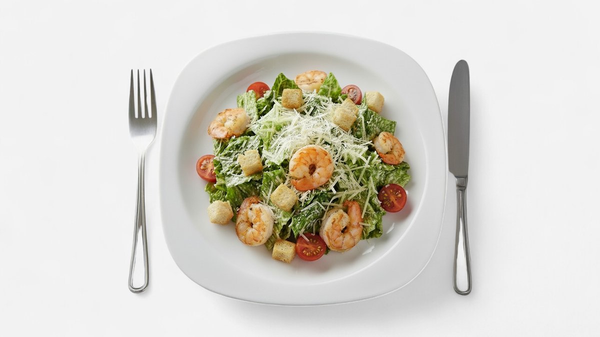 CĒZARA SALĀTI AR TĪĢERGARNELĒM