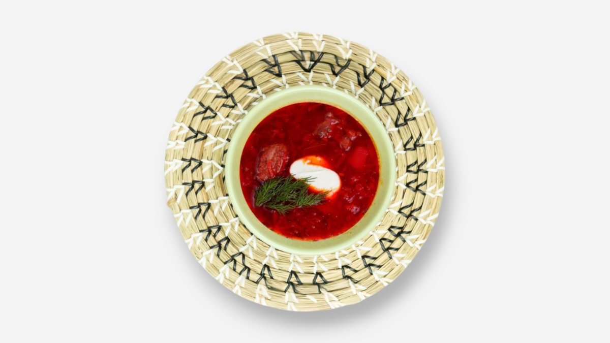 Cūkgaļa, bietes, kāposti, burkāni, kartupeļi, ar svaigiem zaļumiem, skābo krējumu.