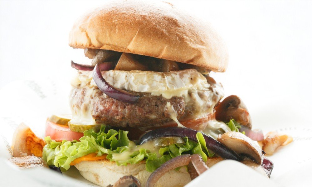 No Latvijas liellopu gaļas ar Čedaras sieru, tomātiem, marinētiem gurķiem un salātu lapām.