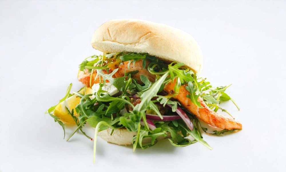 Brioš maizīte, veģetārā kotlete, siera mērce, avokado, tomāti, salātu lapas