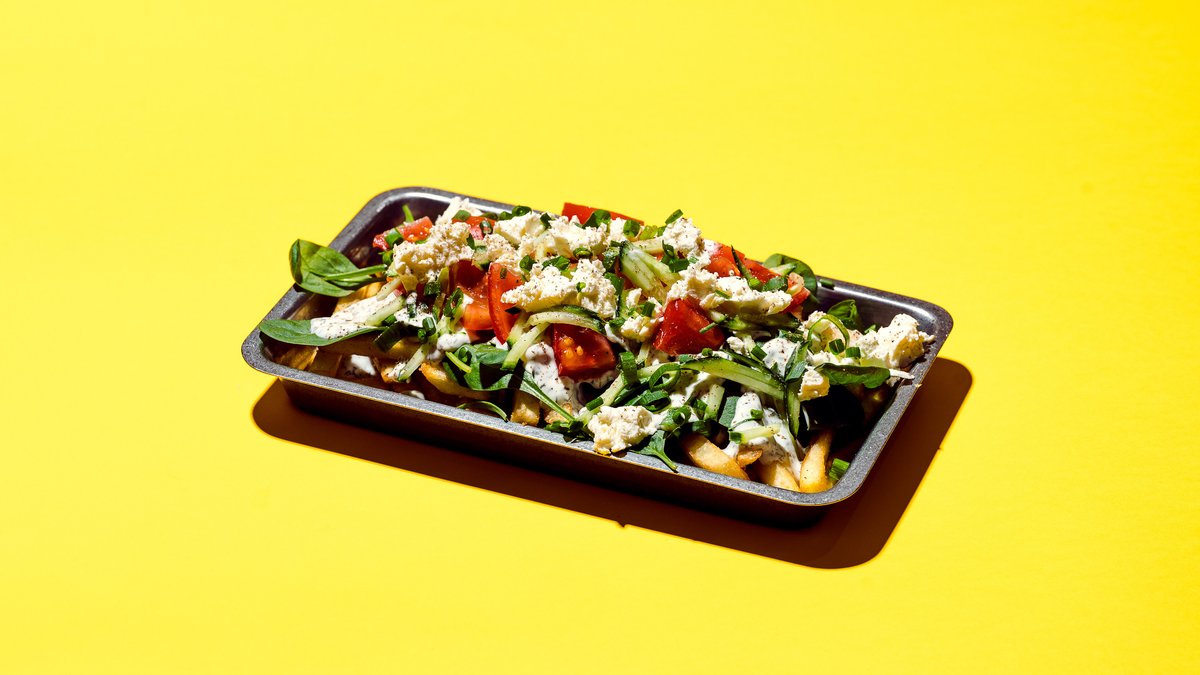 Frī, spināti, fetas siers, svaigais gurķis, tomāti, diļļu mērcīte, lociņi.