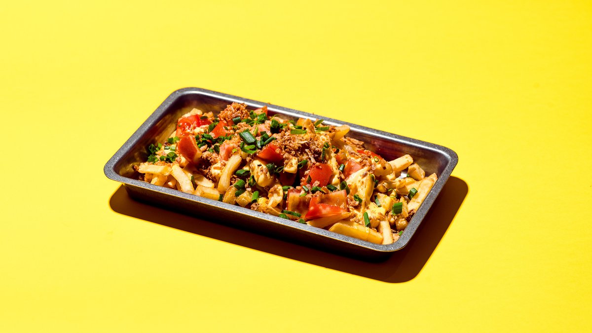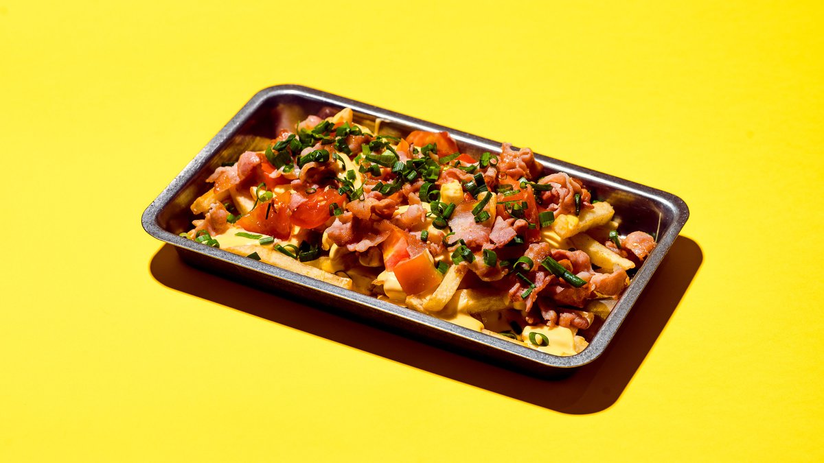 Frī, siera mērce, karamelizēts bekons, tomāti, lociņi.