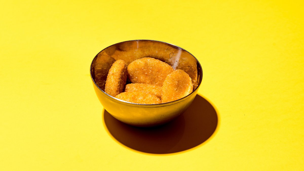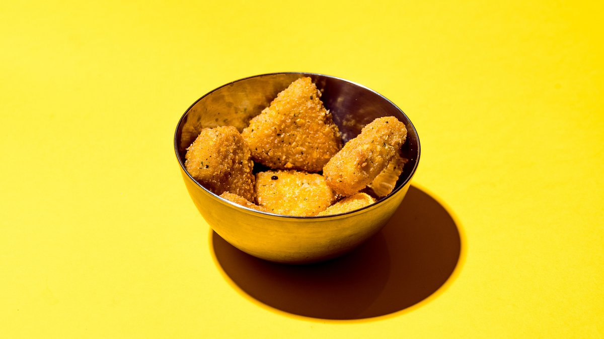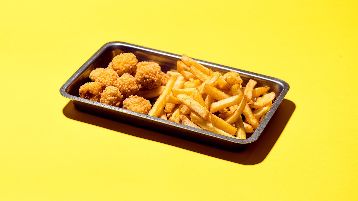 Frī kartupeļi ar kraukšķīgām vistas bumbiņām.