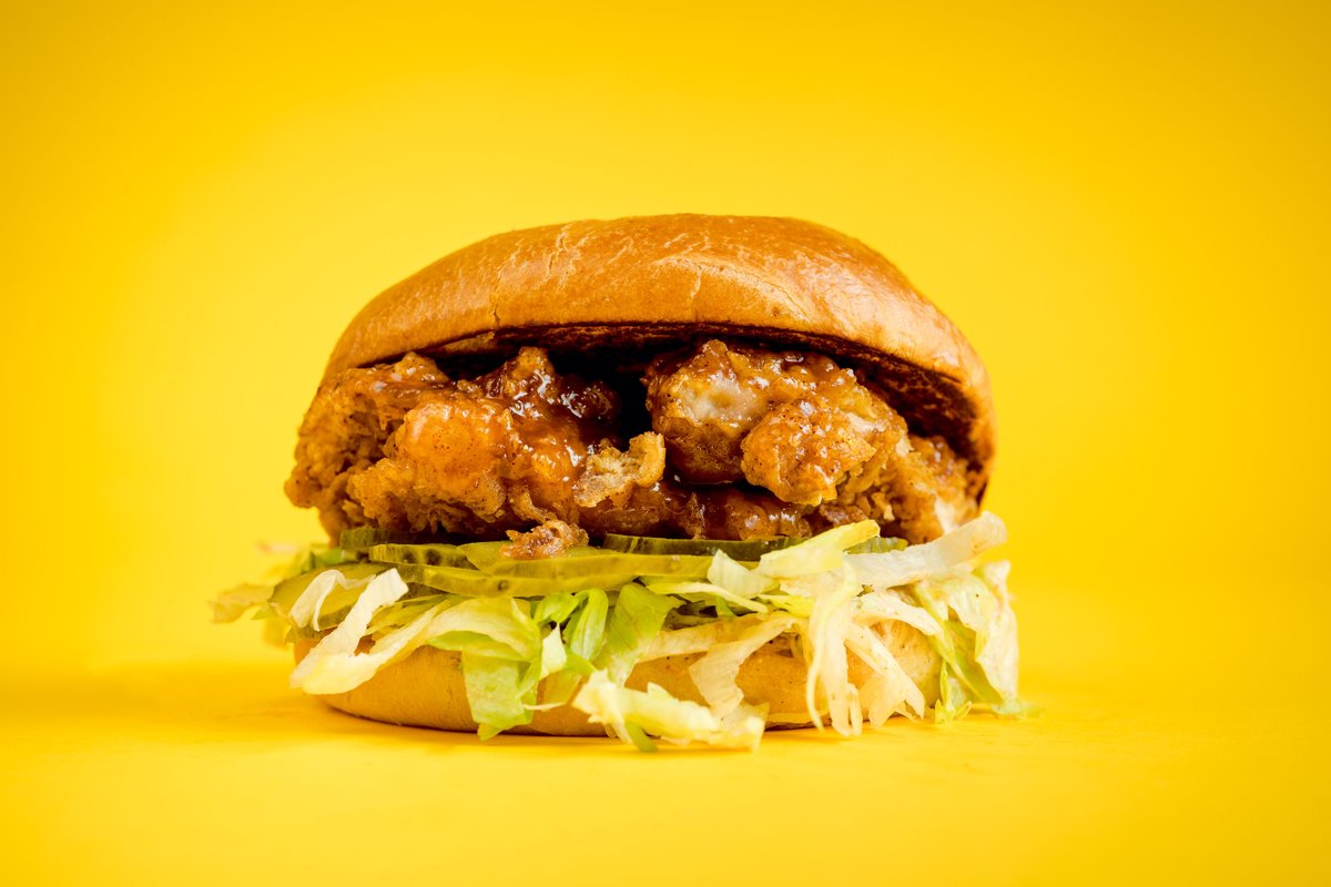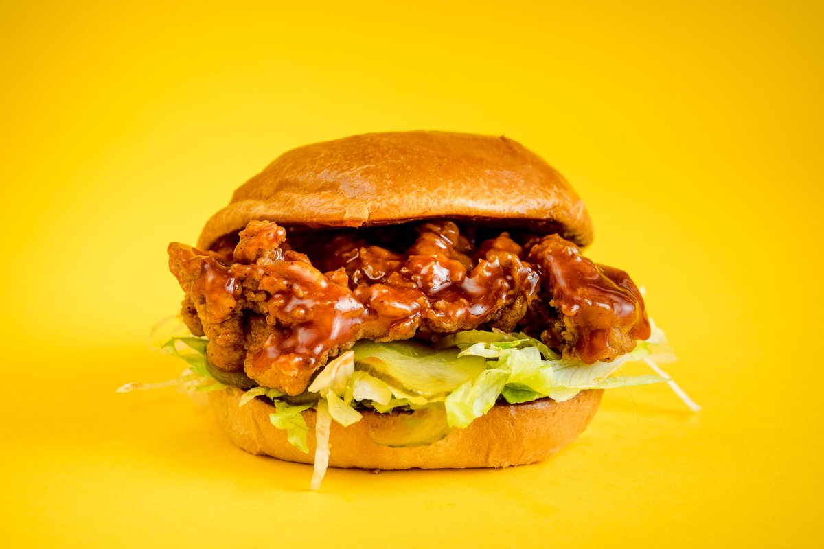 Brioš maizīte, sulīgs vistas šķiņķis kraukšķīgā panējumā, salāti, medus&sinepju mērce,marinēti gurķīši, saldskābās mērces glazūra.