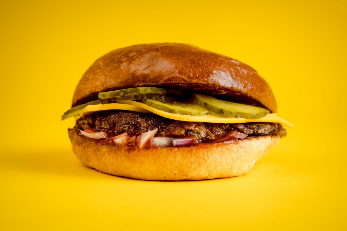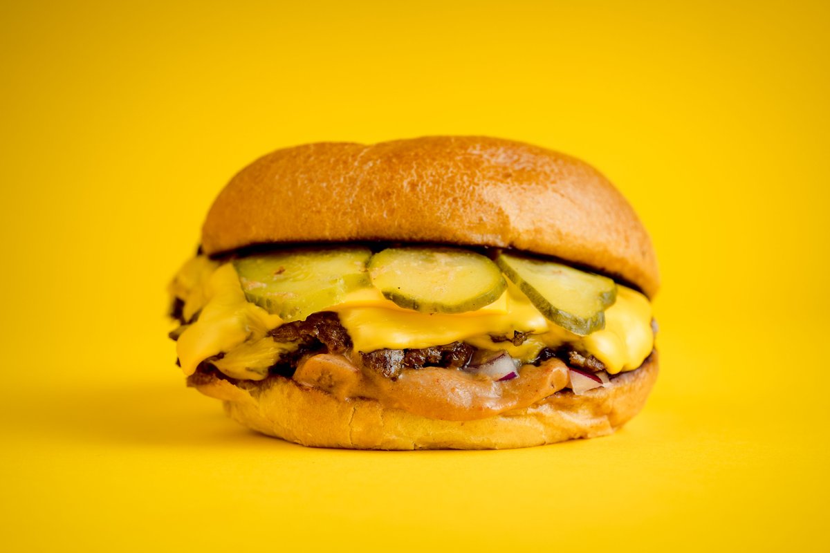 Brioš maizīte, smash liellopa kotlete, siers, kečups, sīpoli, marinētie gurķi.