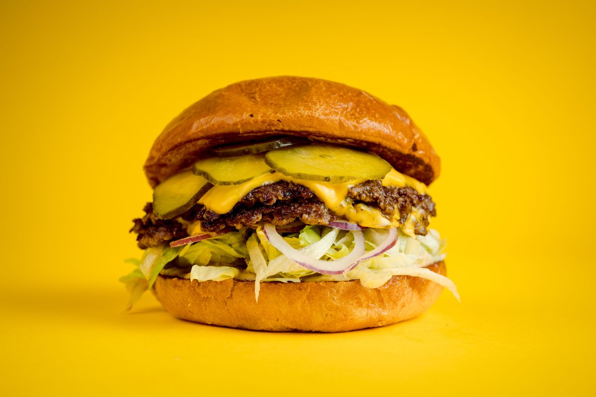 Brioš maizīte, divas smash liellopa gaļas kotletes, siers, sīpoli, kečups, marinēti gurķi.
