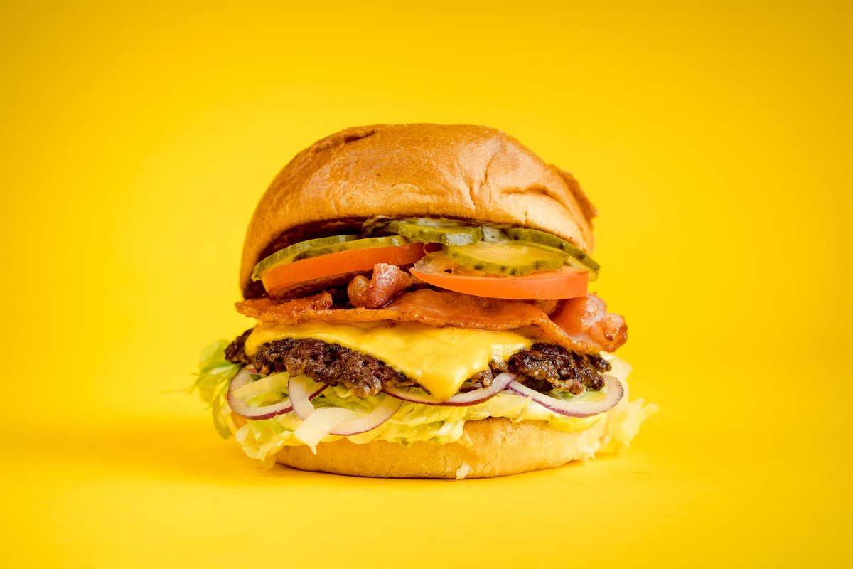 Brioš maizīte, liellopa gaļas kotlete, karamelizēts bekons, siers, tomāts, salāti, sīpoli, ķiploku mērce, marinēti gurķīši.