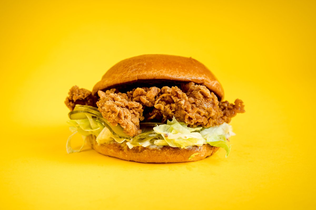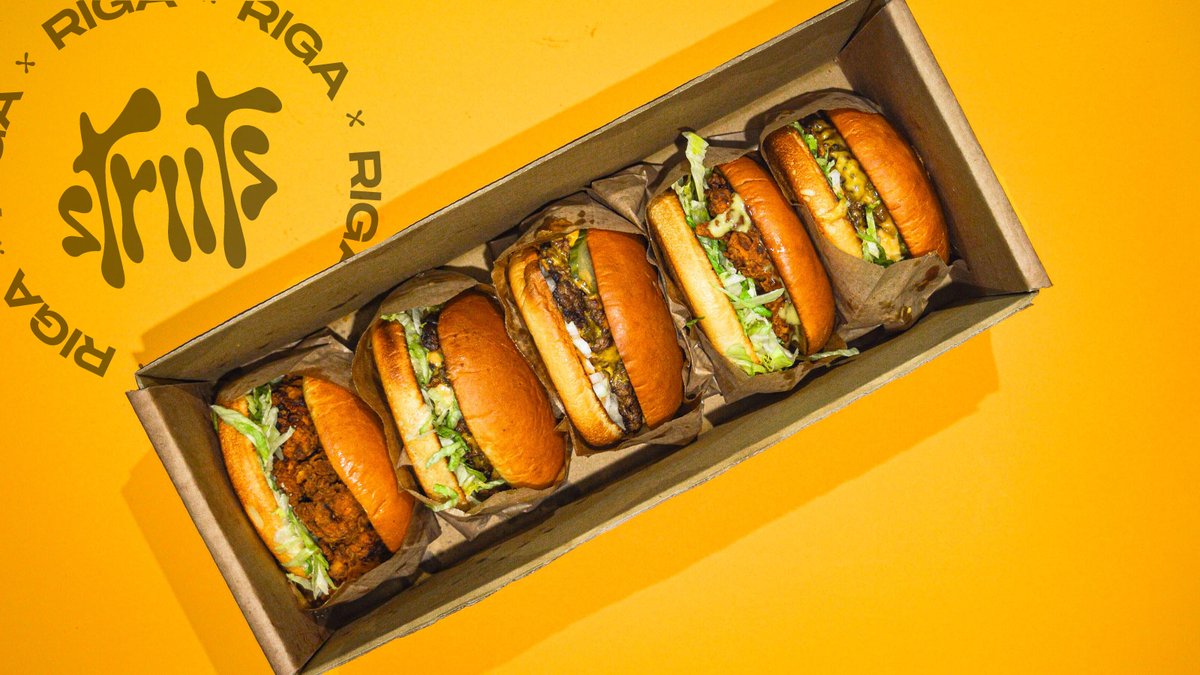 Brioš maizīte, "The Vegetarian Butcher" augu kotlete, siers, salāti, sīpoli, īpašā mērce, strEAT marinēti gurķīši.
