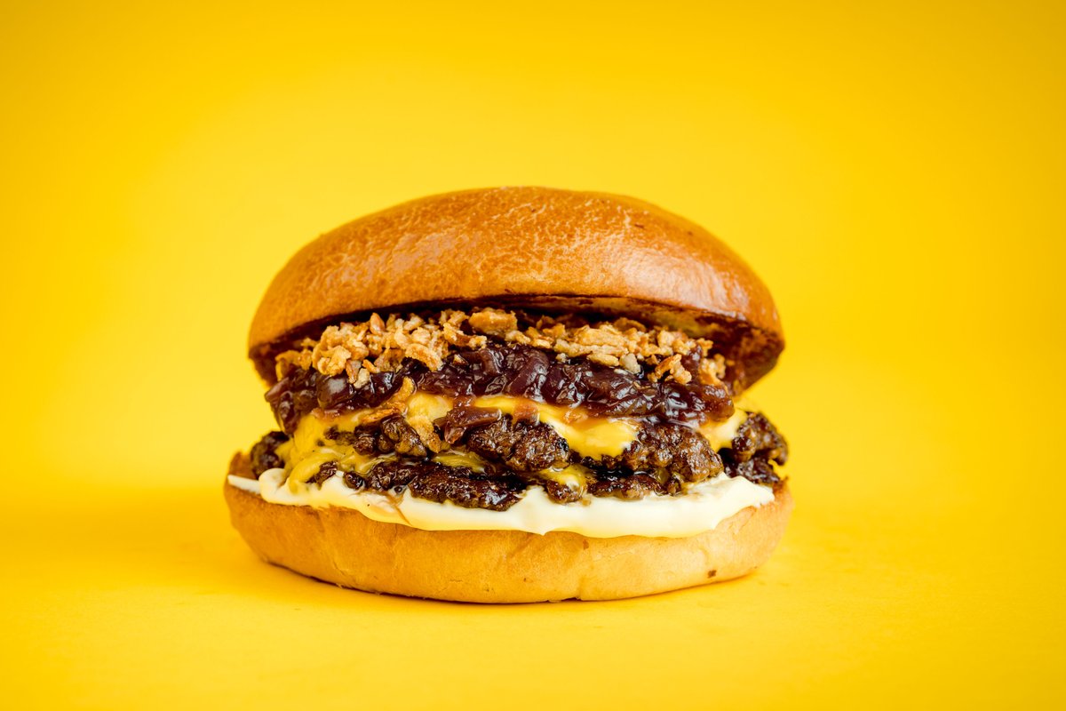 Brioš maizīte, divas Smash liellopa kotletes, kramelizēti sīpoli, majonēze, kraukšķīgie sīpoli, BBQ mērce