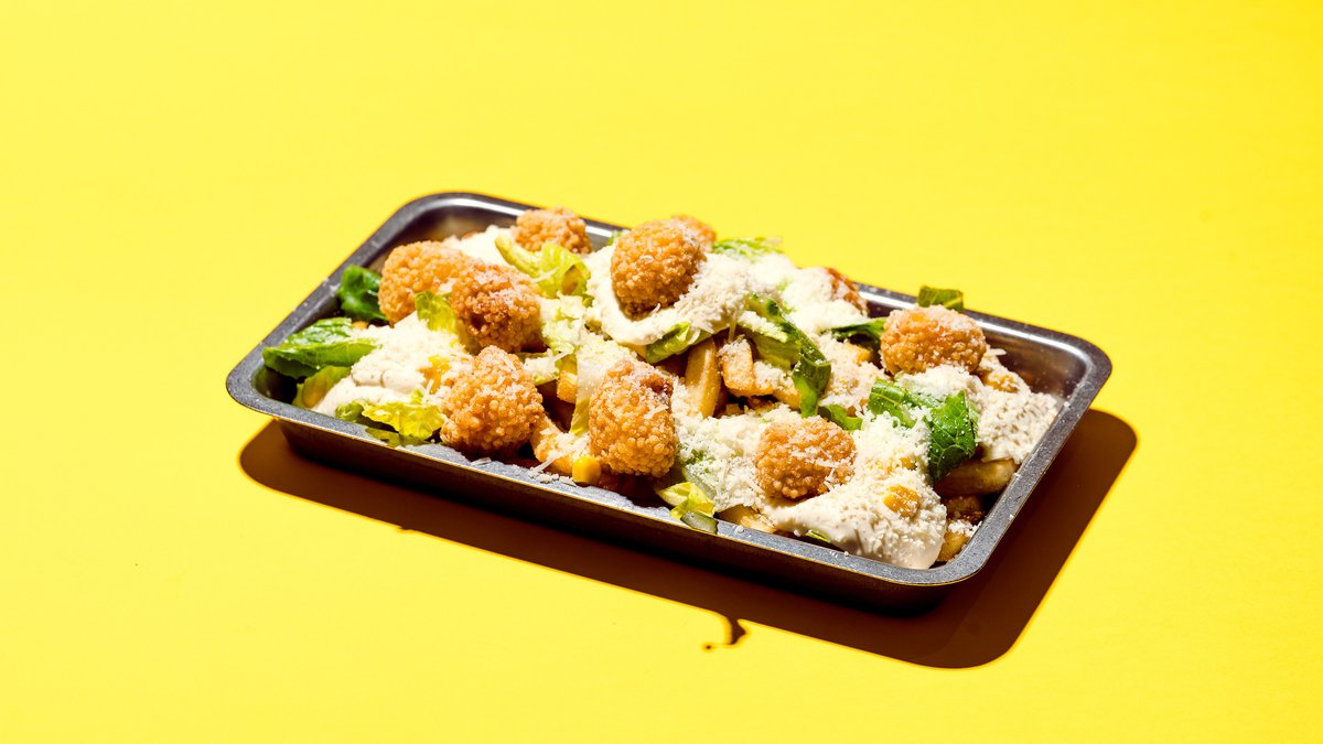 Frī, Romiešu lapas, kraukšķīgā vista, kukurūza, parmazāna siers, mājas Cēzara mērce.