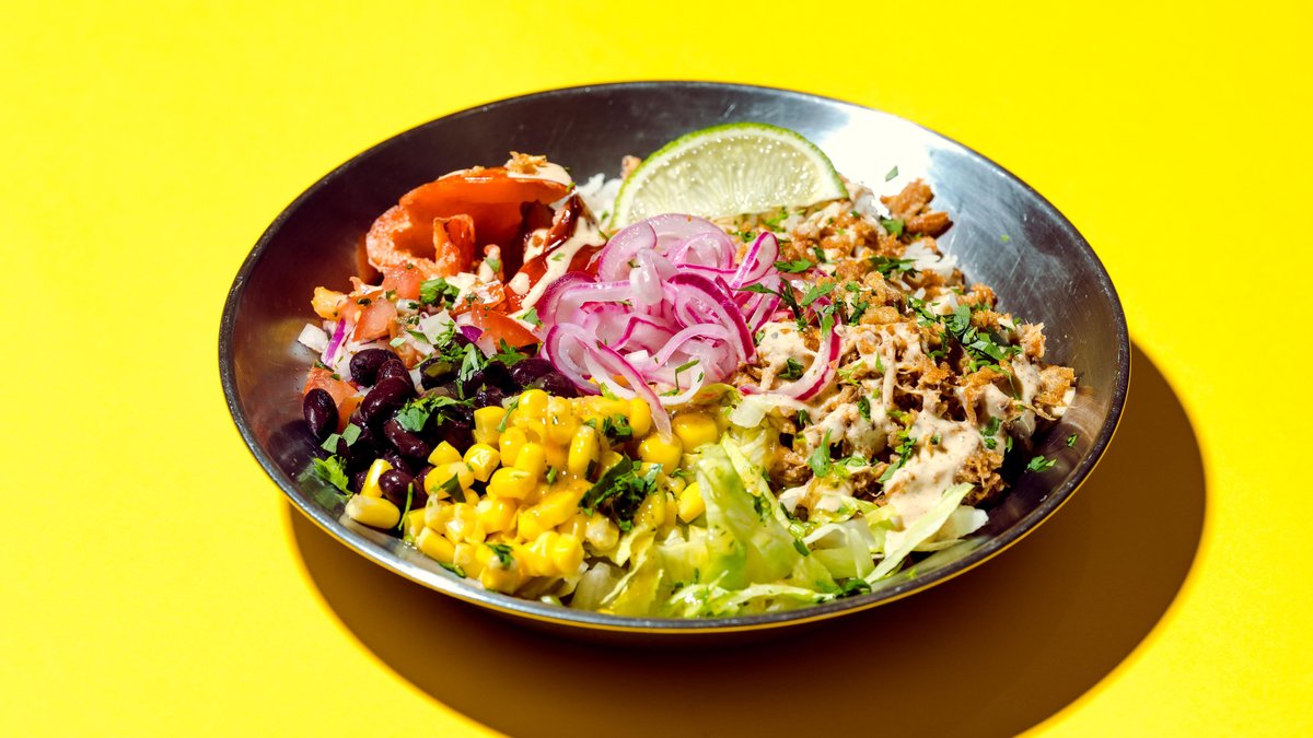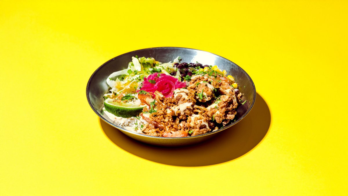 Rīsi, vistas šķiņķis kraukšķīgā panējumā, grilēta paprika, Chipotle majonēze, Pico de Gallo (svaigo tomātu salsa), melnās pupiņas, kukurūza, salāti, marinēti sīpoli, kraukšķīgie sīpoli, laima daiviņa un pēc izvēles - Pikantā Mango salsa vai Maigā tomātu salsa.