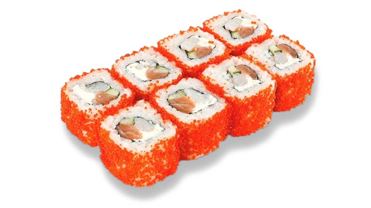 Rolls ar laša fileju, garneli, krēmsieru, avokado, gurķi, masago ikriem