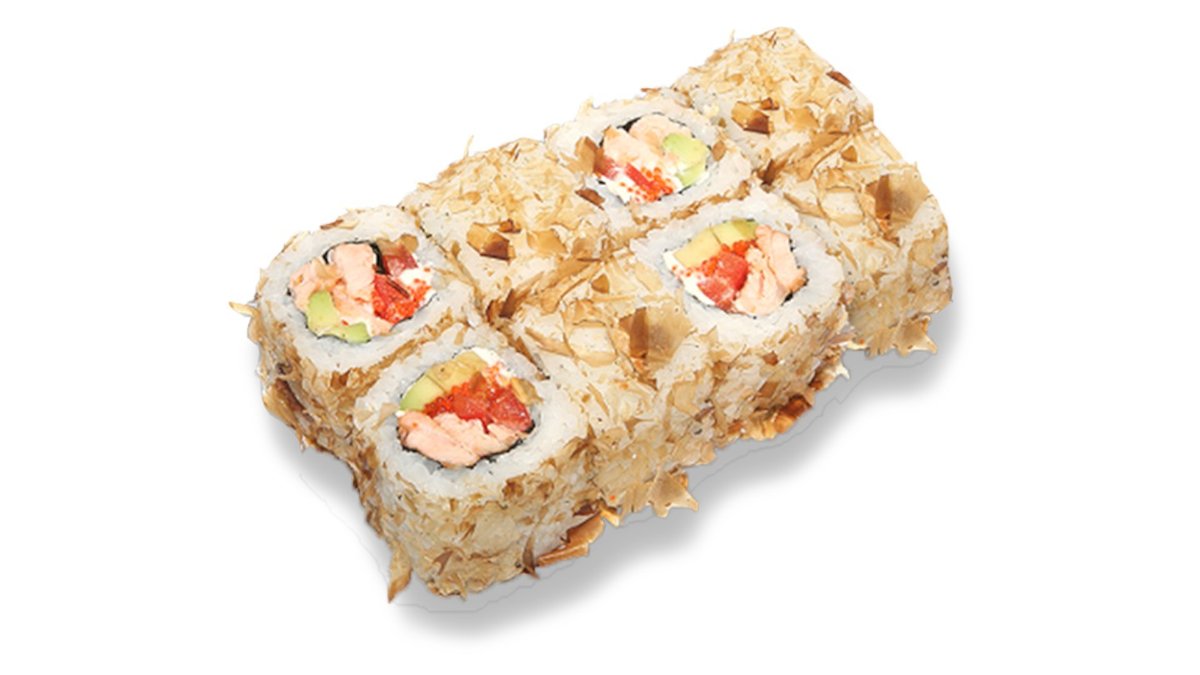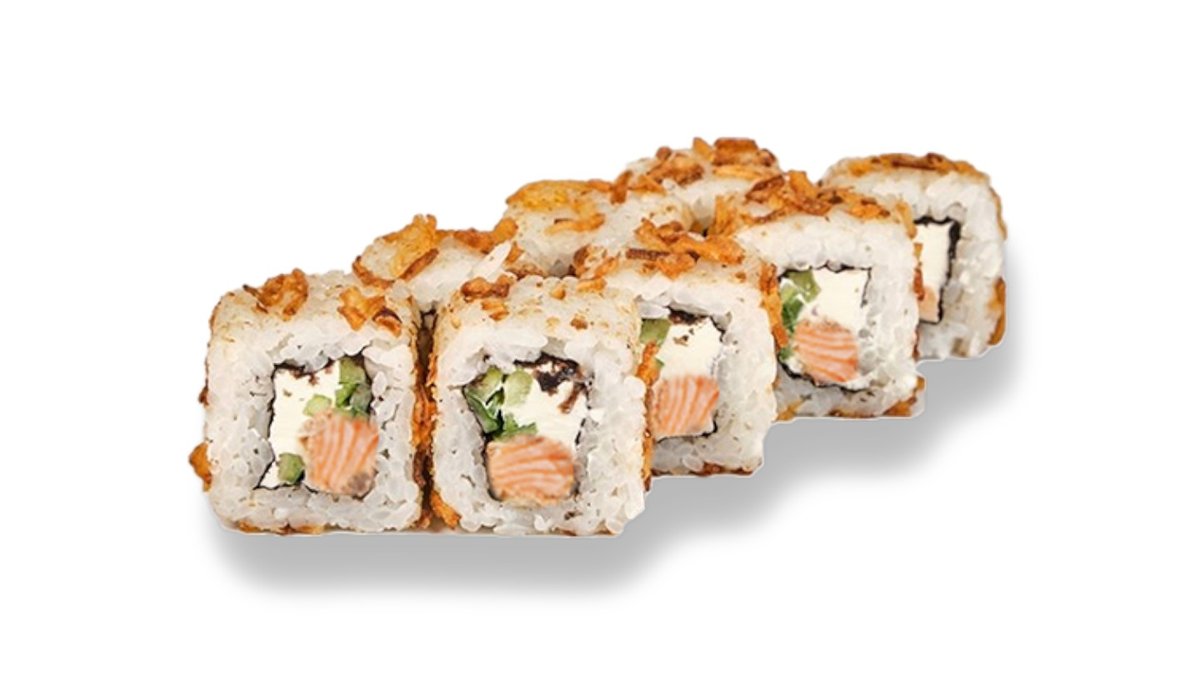 Cepts rolls ar tīģergarneli panējumā, kūpinātu lasi, kraukšķīgiem sīpoliem, spaisi mērci, sezamu