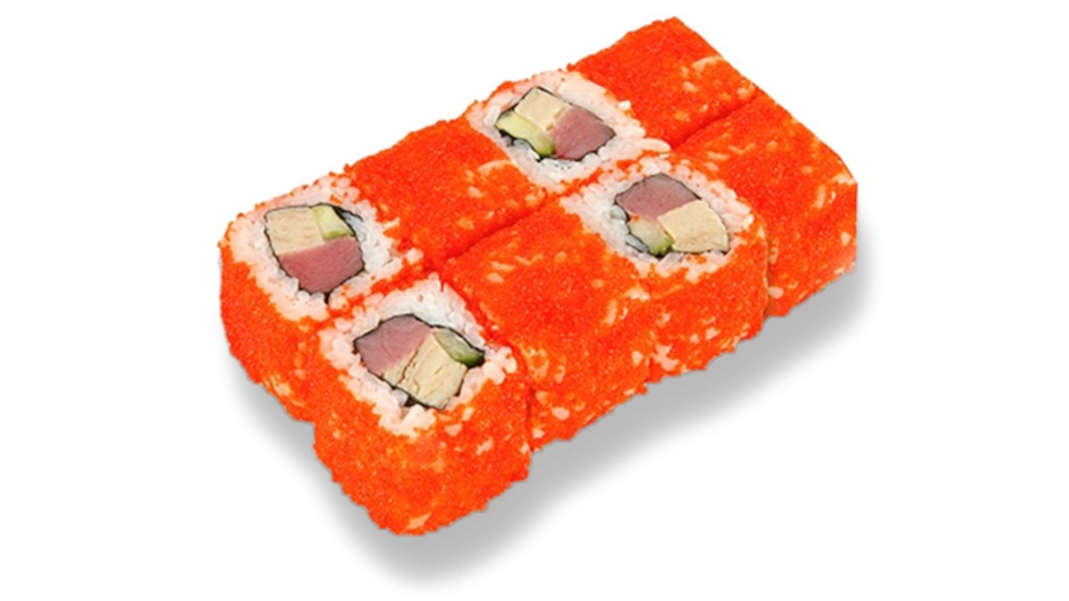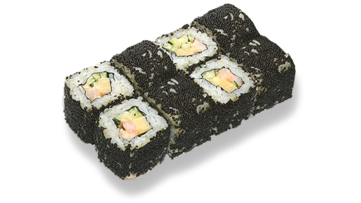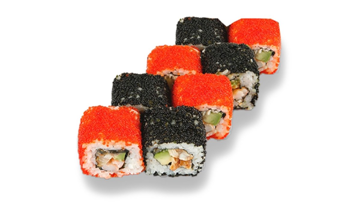 Rolls ar zuti, garneli, japāņu majonēzi, avokado, sarkaniem un melniem masago ikriem