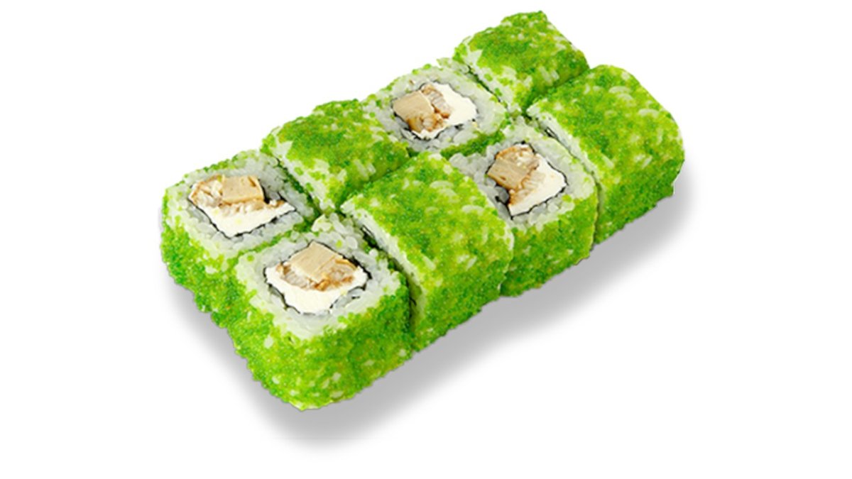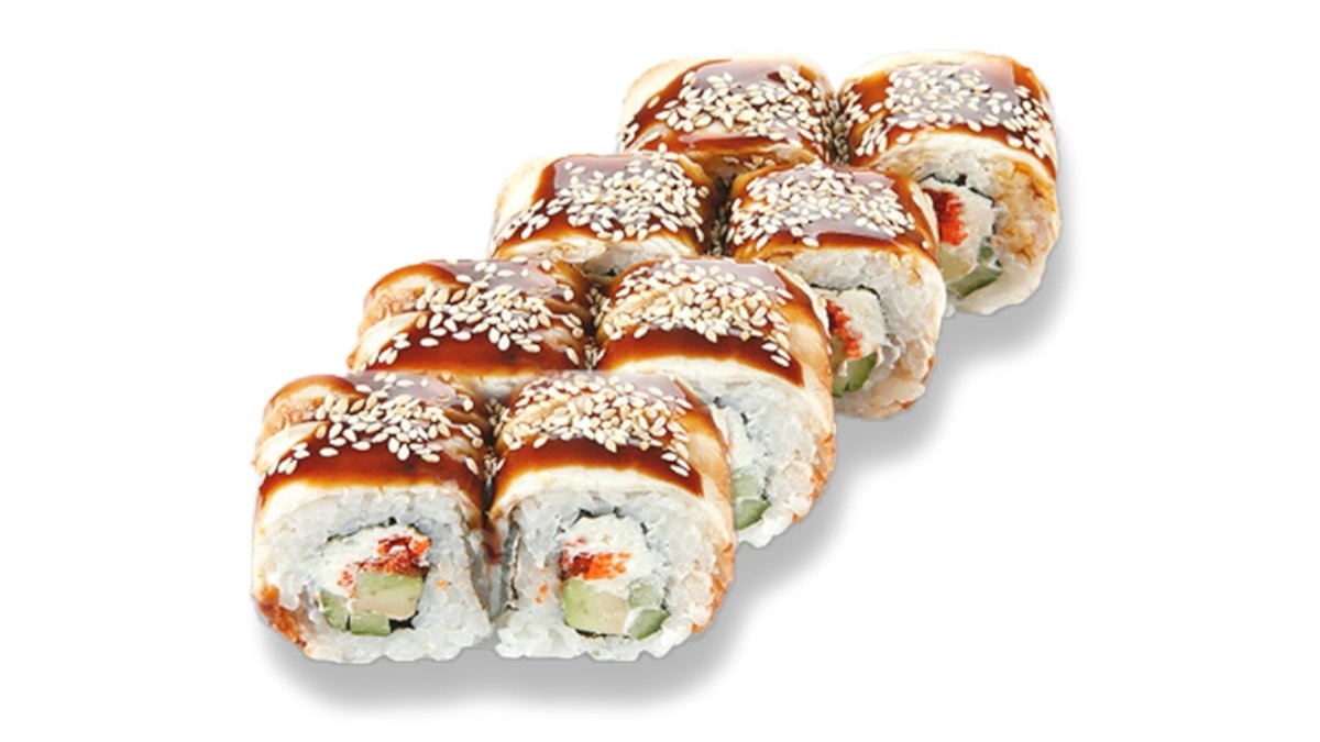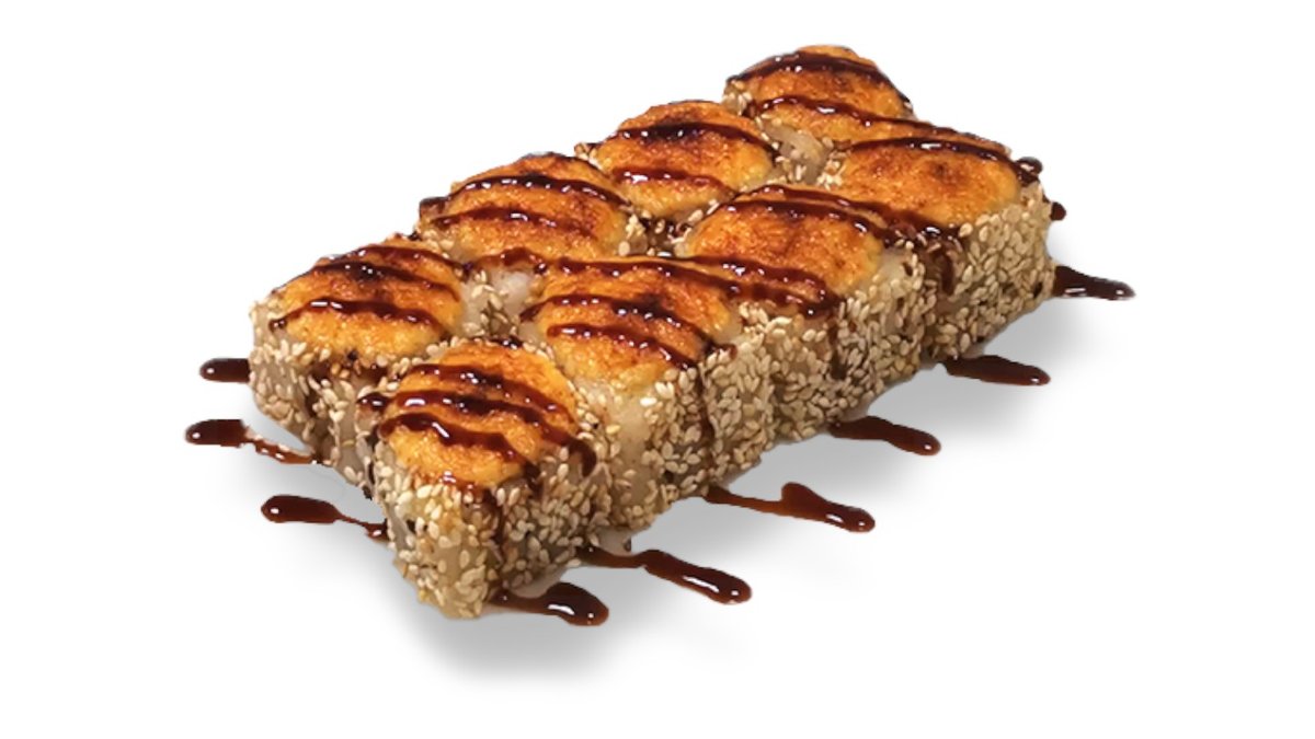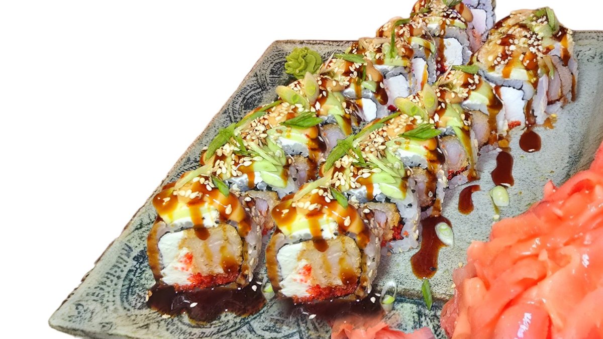 Rolls ar tempūras tīģergarneli, krēmsieru, masago ikriem, avokado, teriaki mērci, chili mayo mērci.