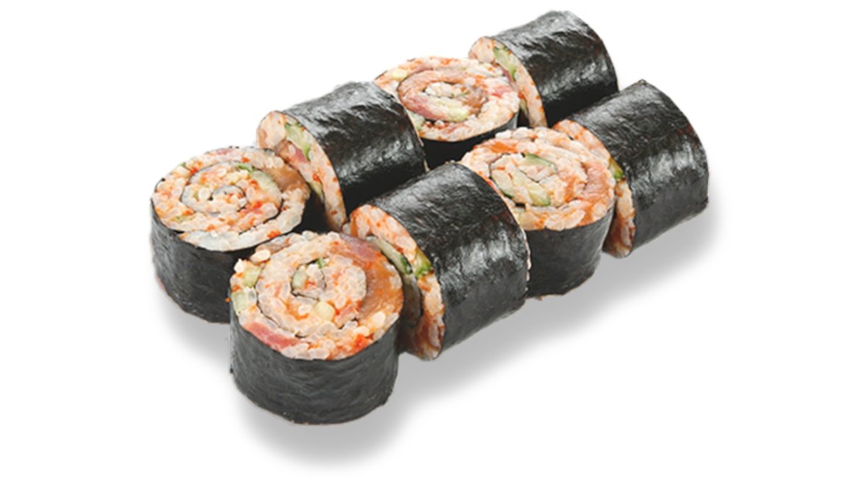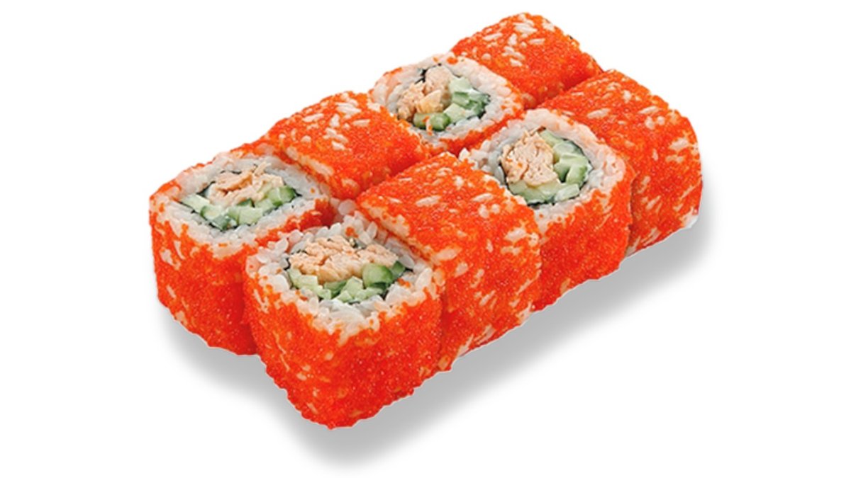 Rolls ar laša fileju, tuņča fileju, masago ikriem, gurķi, pikanto mērci