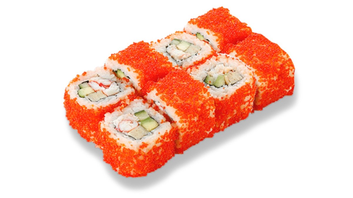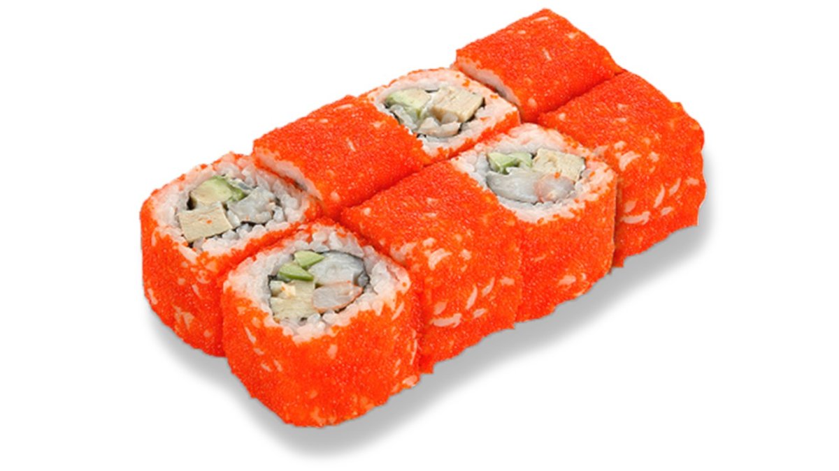 Rolls ar krabju nūjiņu, japāņu omleti, avokado, japāņu majonēzi, masago ikriem