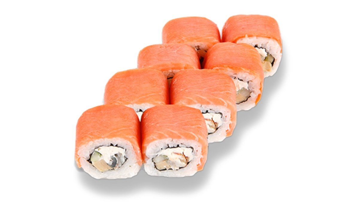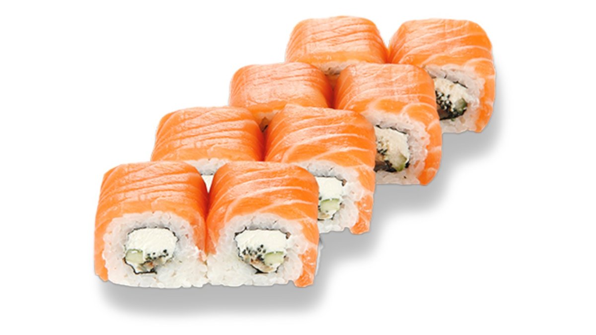 Sastāvā – Philadelphia Deluxe, Rolls ar tīģergarneli panējumā, Rolls ar laša fileju, Rolls ar krēmsieru, garnelēm, Rolls ar krēmsieru, gurķi, kūpinātu vistu