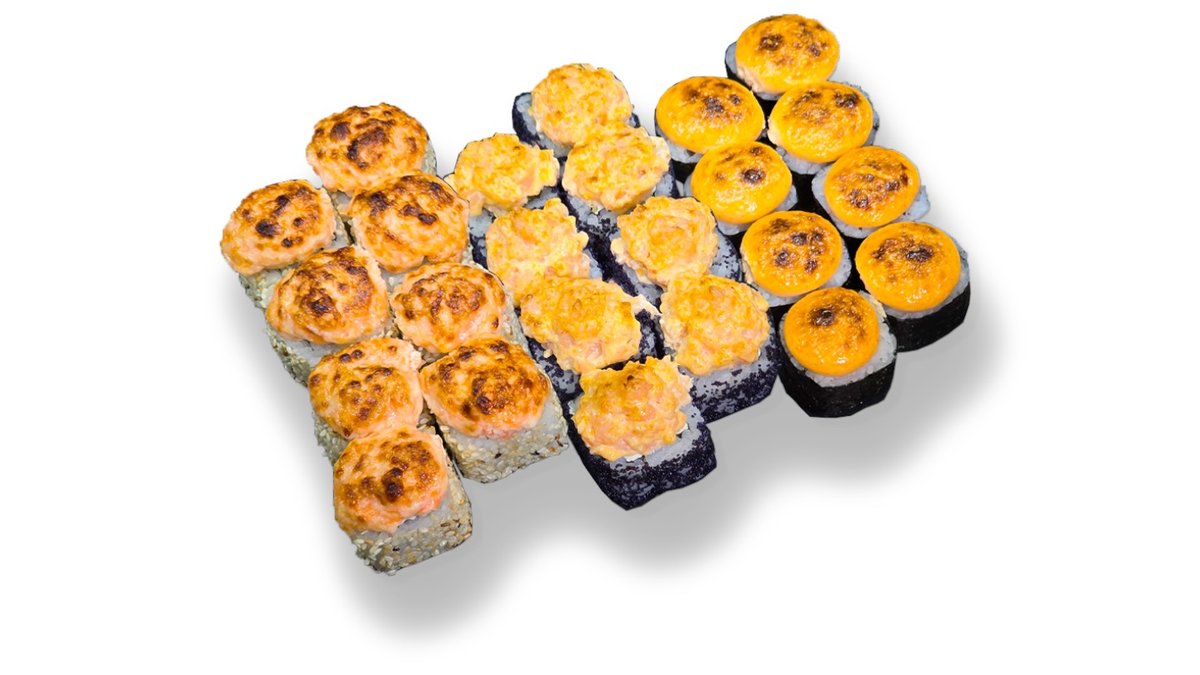 Siltais rolls ar krēmsieru, japāņu omlete, masago ikri, bekona spaisi mērces cepurīte. Siltais rolls ar tomago (japāņu omleti), krēmsieru, tomātu, ar pikanto laša cepurīti.