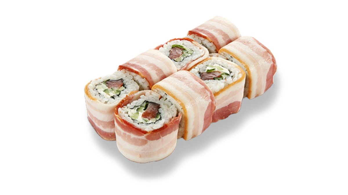 Rolls ar laša fileju, ceptu bekonu, gurķi, krēmsieru, lokiem