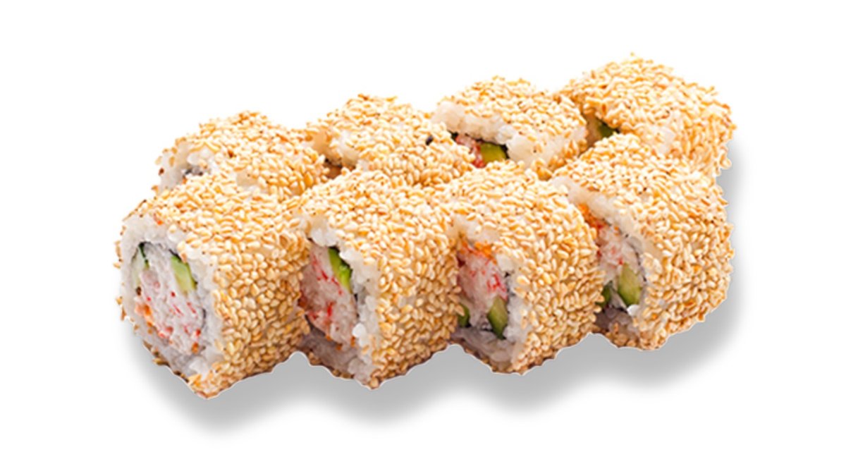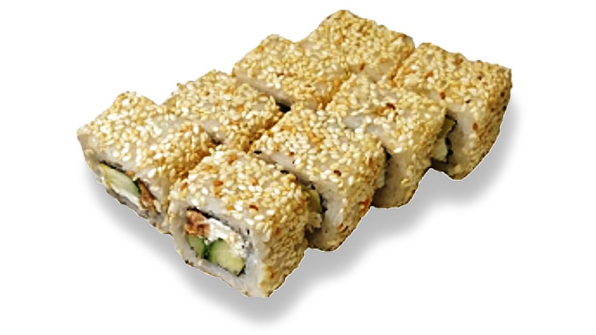 Rolls ar tīģirgarneli apceptu tempūras mīklā, gurķi, krēmsieru, sezamu