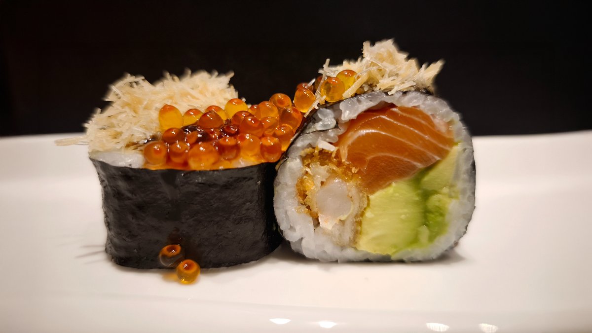 Avokado, tuncis, garneles, lasis, unagi mērce, foreļu ikri, masago ikri