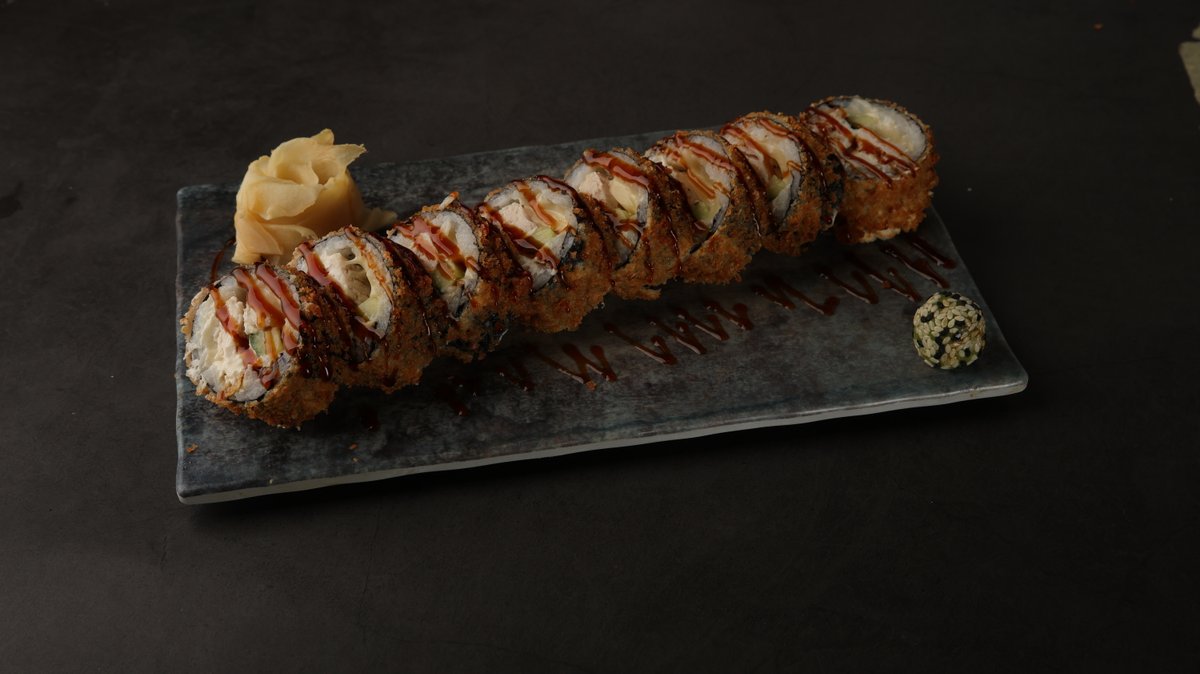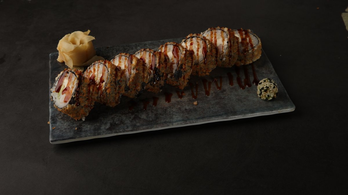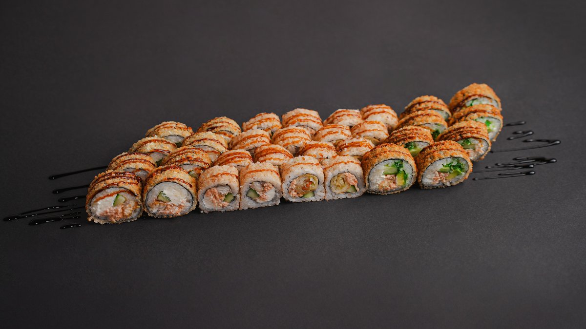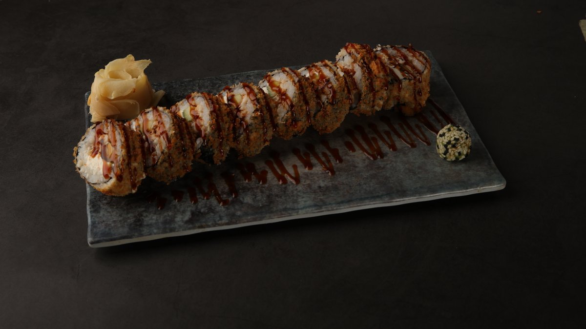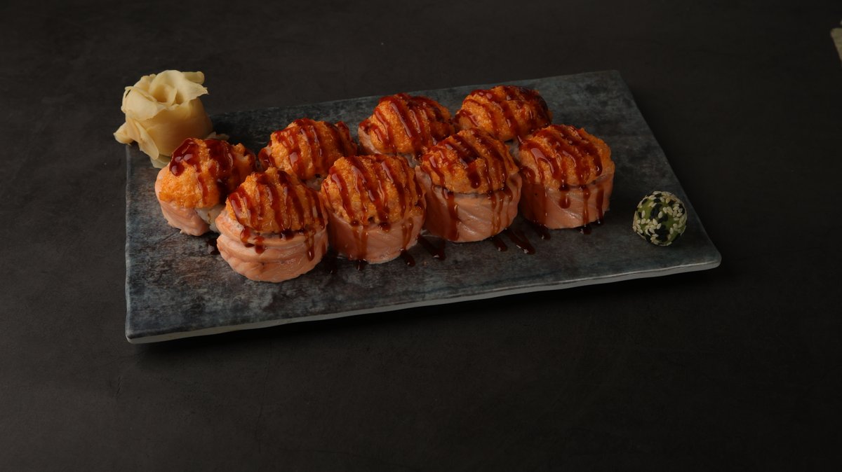 Rīsi, nori, krēmsiers, avokado, cepts terijaki lasis, gurķis, wakame, tempura maisījums, panko, unagi mērce Рис, нори, сливочный сыр, авокадо, терияки лосось, огурец, вакаме, темпура, панко, унаги соус Rice, nori, cream cheese, avocado, teriyaki salmon, cucumber, wakame, tempura, panko, unagi sauce