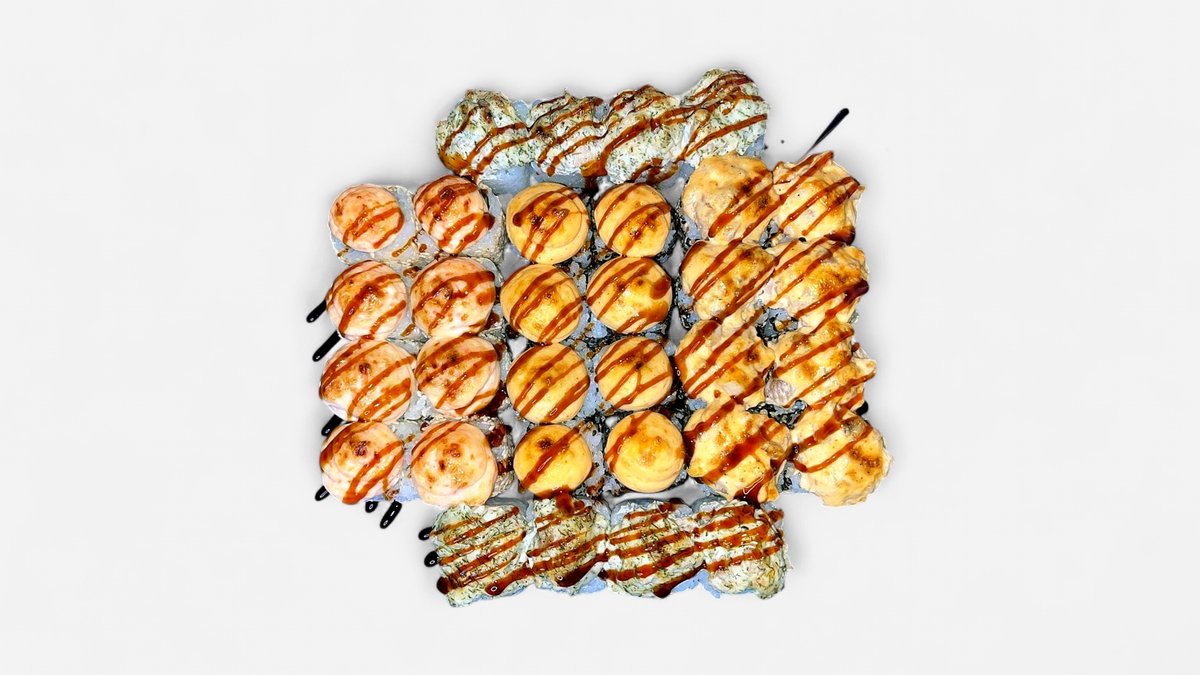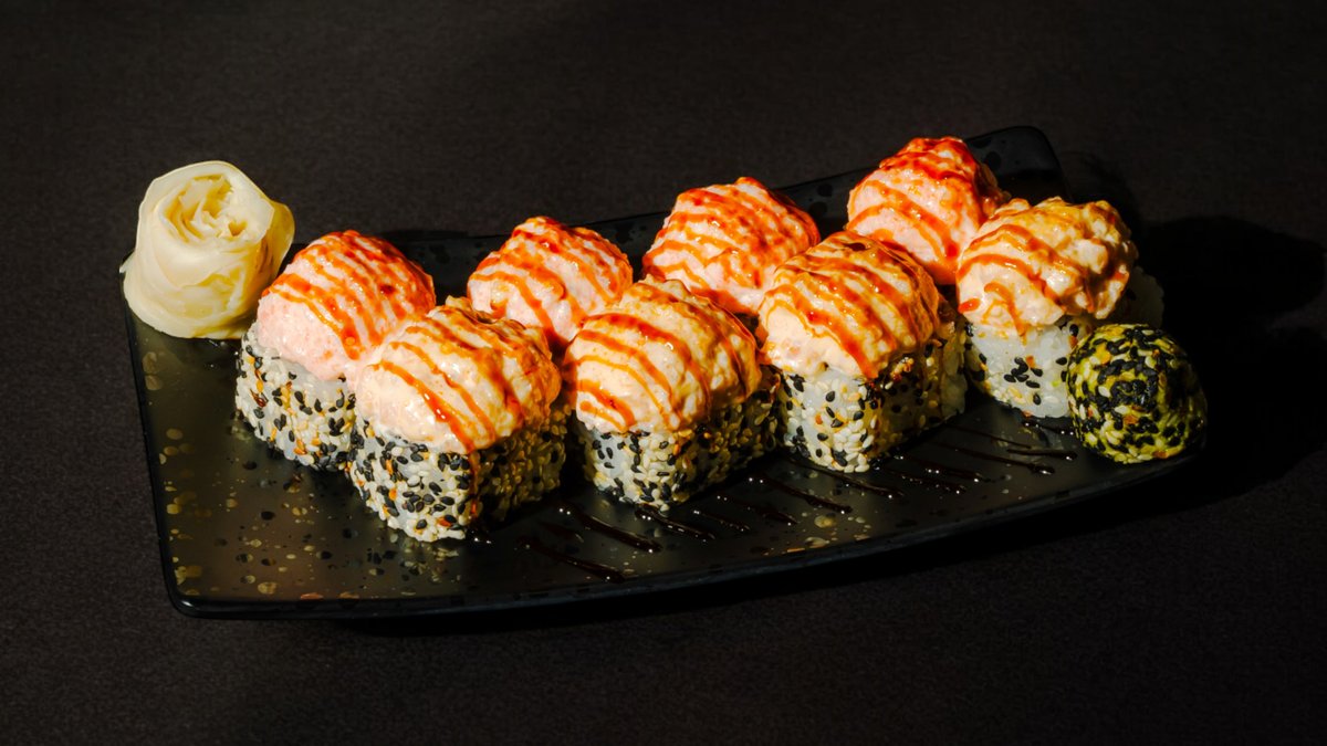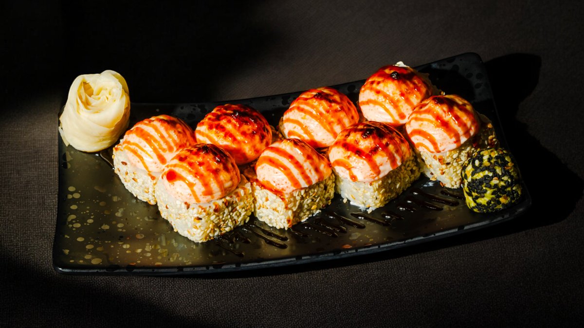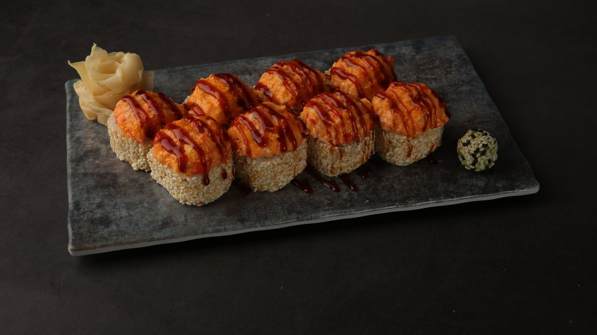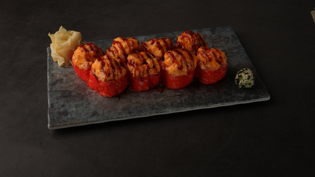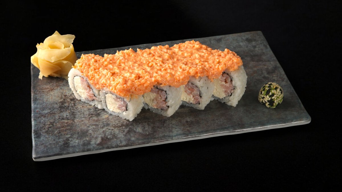 Rīsi, nori, krēmsiers, avokado, cepts terijaki lasis, gurķis, wakame, tempura maisījums, panko, unagi mērce Рис, нори, сливочный сыр, авокадо, терияки лосось, огурец, вакаме, темпура, панко, унаги соус Rice, nori, cream cheese, avocado, teriyaki salmon, cucumber, wakame, tempura, panko, unagi sauce