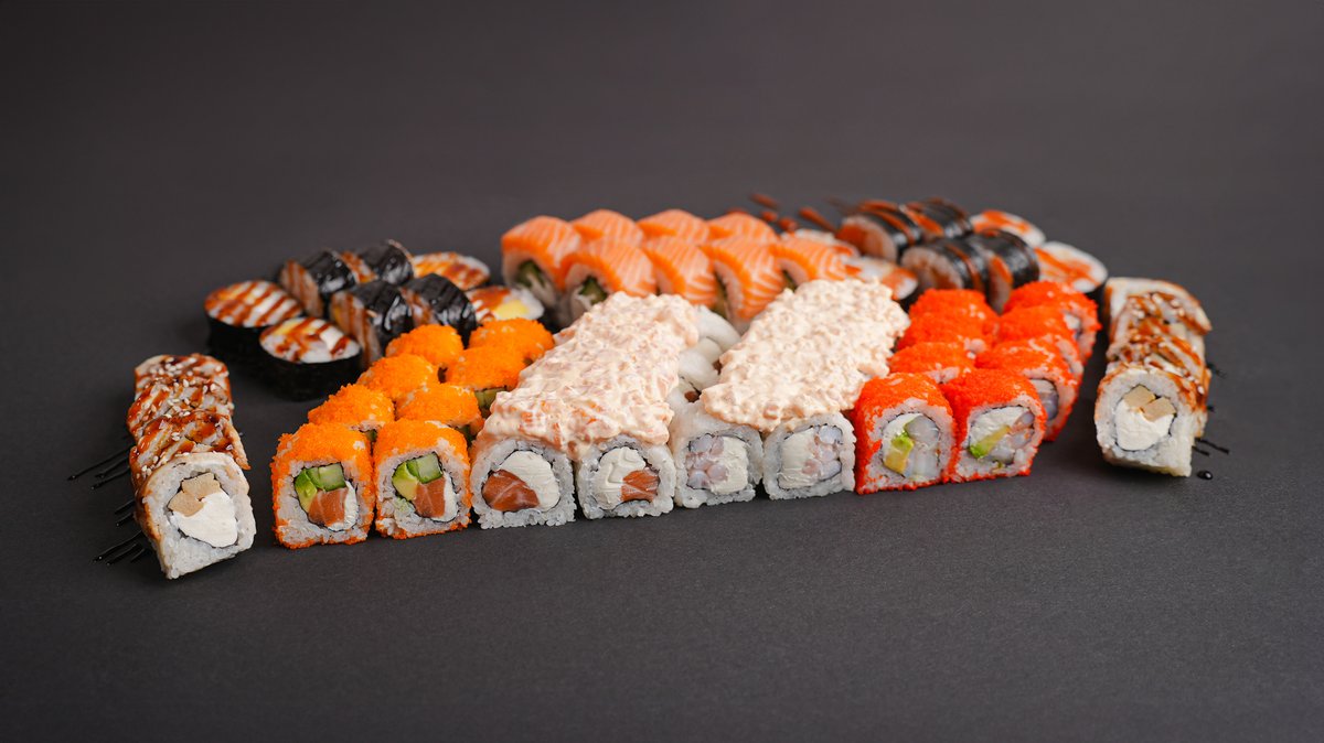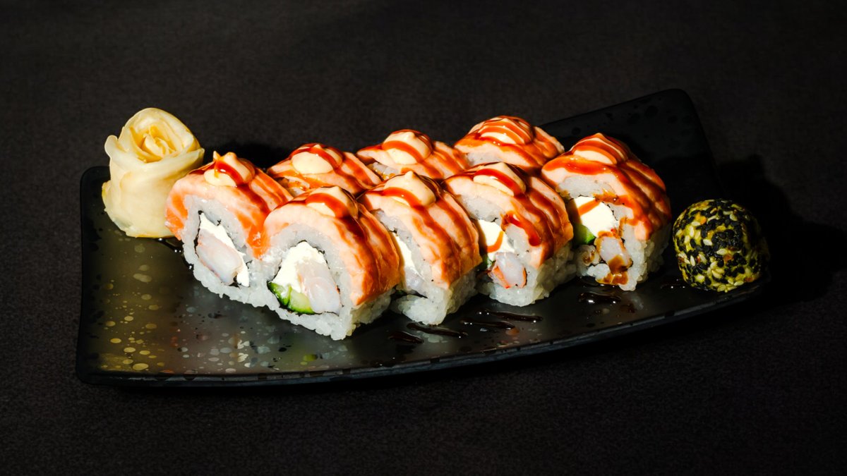 Rīsi, nori, krēmsiers, japāņu omlete, gurķis lidojošās zivs ikri, garneles sierā mērcē, unagi mērce Рис, нори, сливочный сыр, томаго, огурец,красная масаго, сырные креветки, унаги соус Rice, nori, cream cheese, tomago, cucumber, red masago, cheese shrimp, unagi sauce