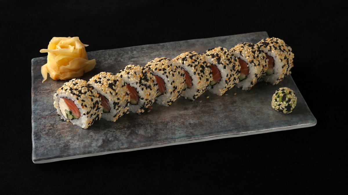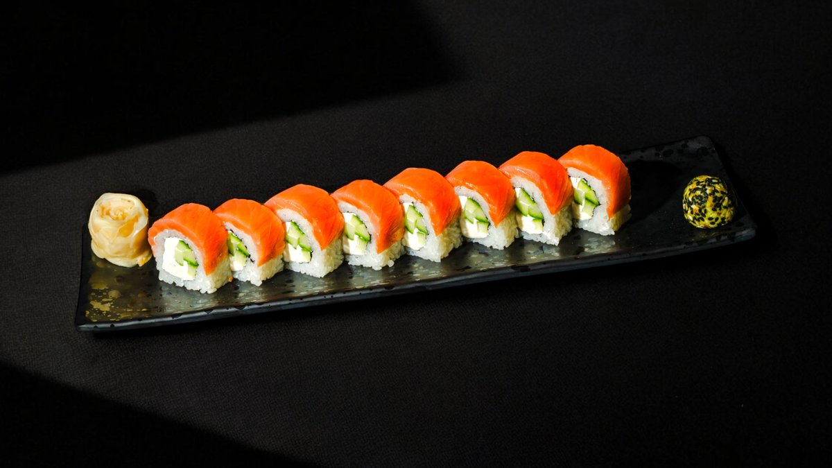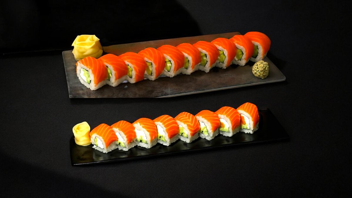 Rolls ar svaigu lasi, avokado un mīkstu krēmsieru. Ролл со свежим лососем, авокадо и нежным сливочным сыром. Roll with fresh salmon, avocado and soft cream cheese.