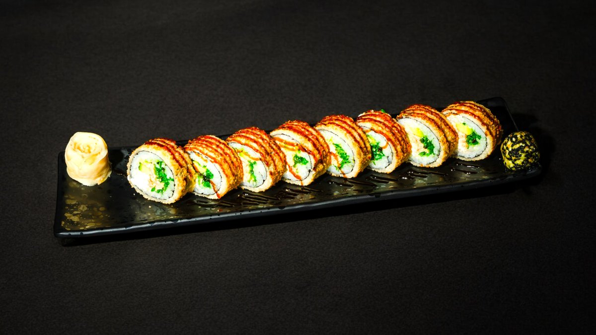 Rīsi, nori, krēmsiers, zutis, cepts terijaki lasis, gurķis, tempuras maisījums, panko, unagi mērce Рис, нори, сливочный сыр, угорь, лосось терияки, огурец, темпура микс, панко, унаги соус Rice, nori, cream cheese, eel, salmon teriyaki, cucumber, tempura mix, panko, unagi sauce