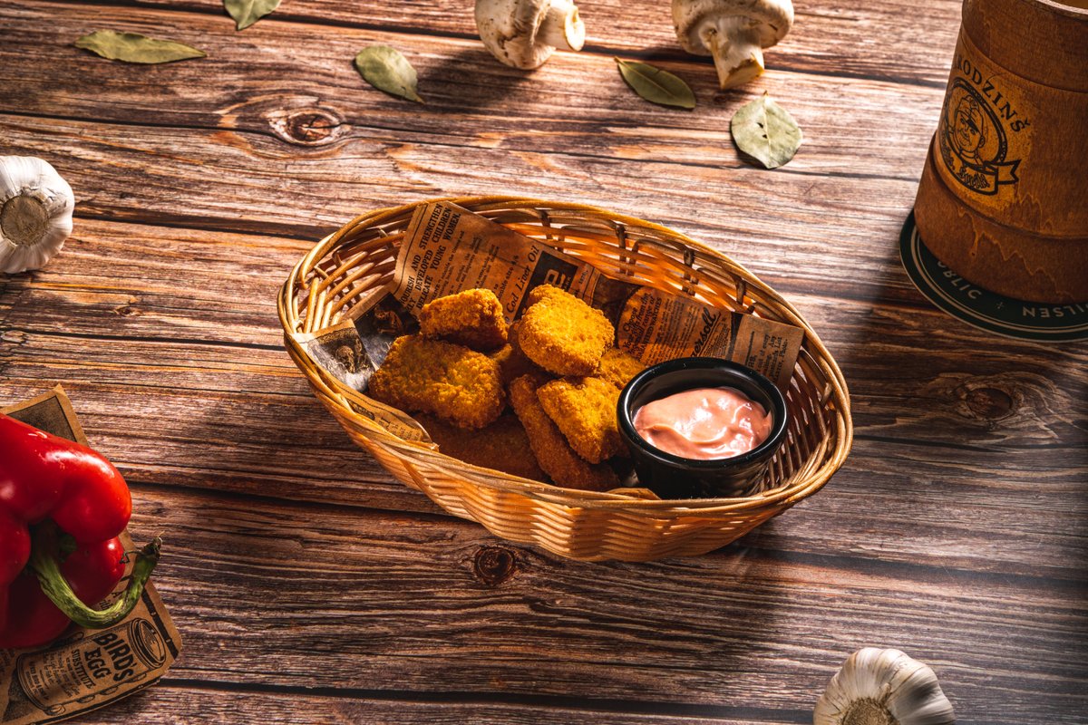 kroketes, cūkgaļa, kūpināta gaļa ar sieru, čili mērcē