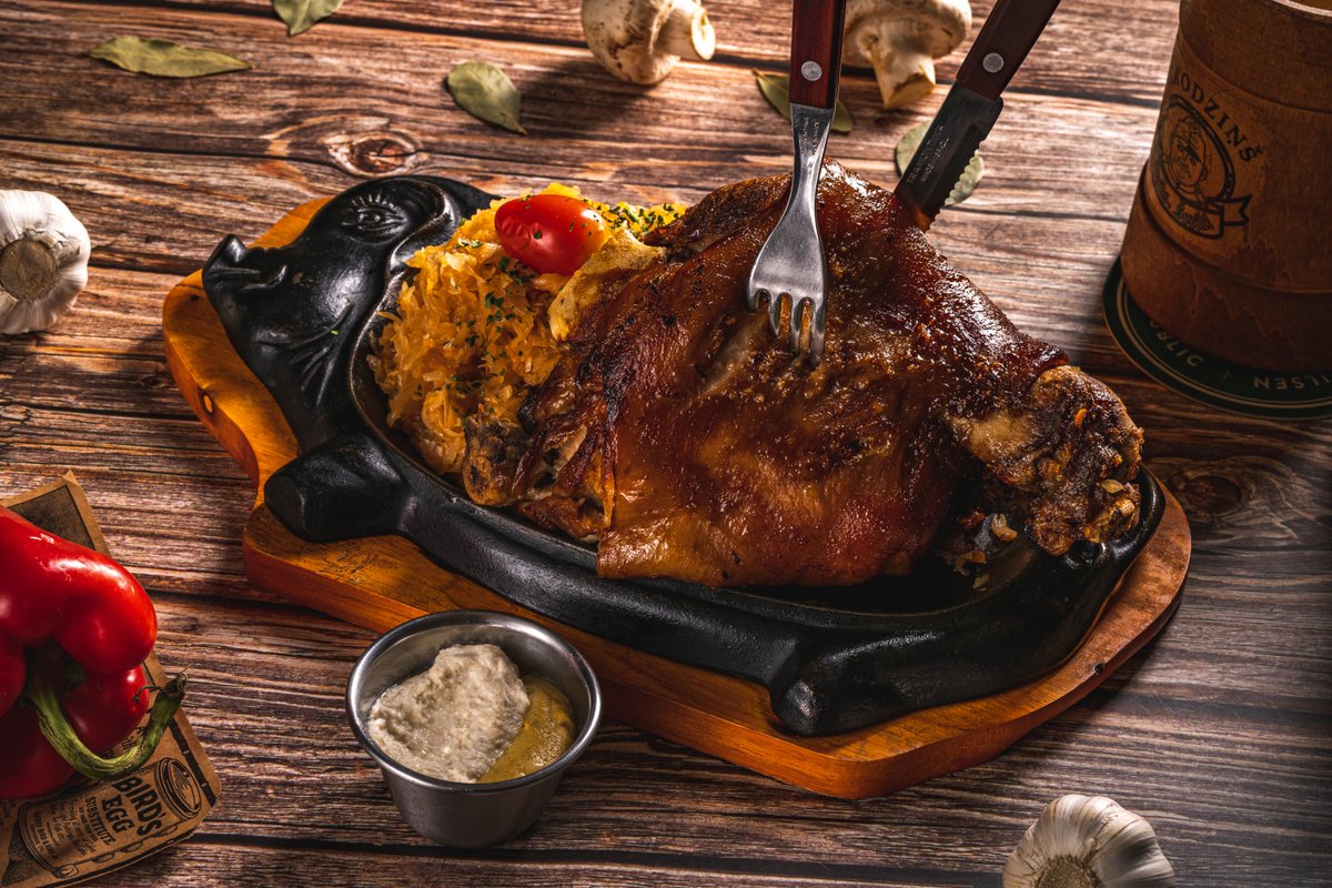 cūkgaļa ar meža sēņu mērci, kartupeļu knēdeļi
