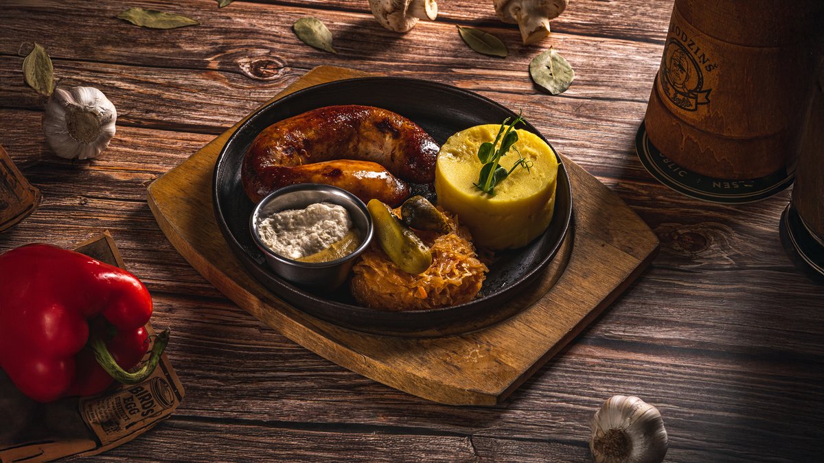 grilētas cūkgaļas desiņas ar sieru, kartupeļu biezenis, sautēti kāposti, mārrutki