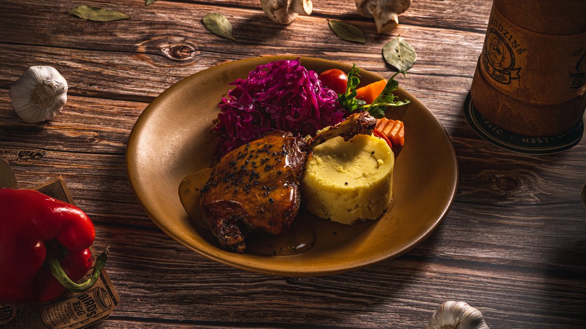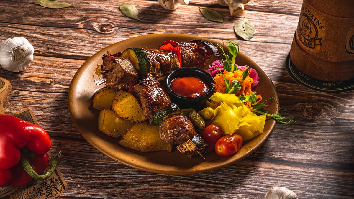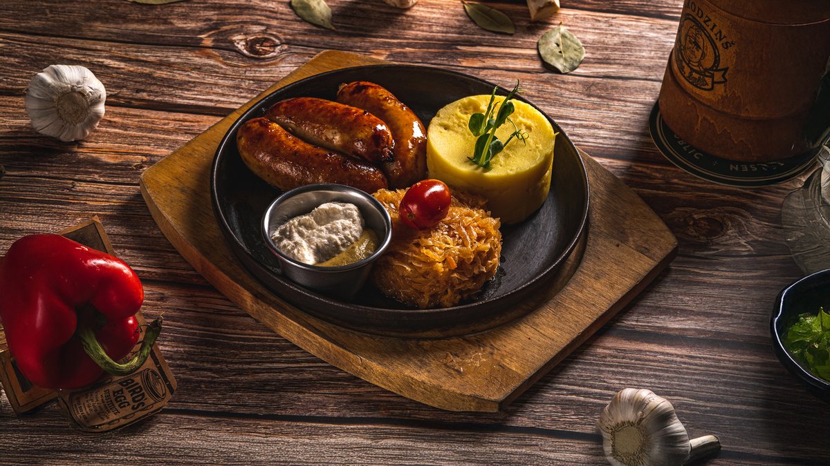 grilētas liellopu gaļas desiņas, kartupeļu biezenis, sautēti kāposti, mārutki